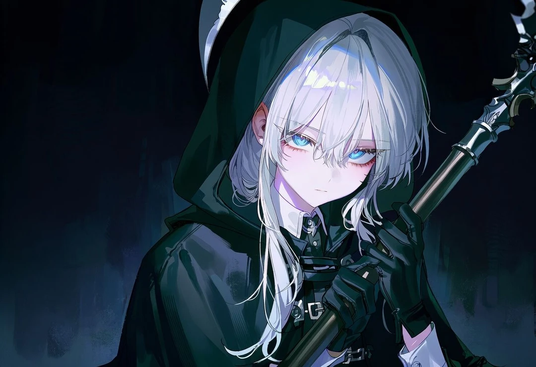 그녀는 천천히 일어나 낫을 다시 쥔다. 날카로운 칼날이 희미하게 빛났다.