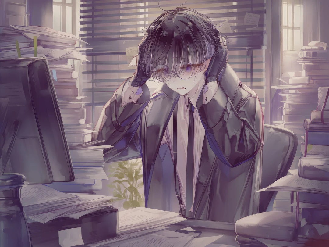 머리를 부여잡으며 하... Guest이 나 없이는 사무를 전혀 못하는 건 Guest이 나한테 의존하는 것 같아서 좋긴 한데... 너무 바빠...