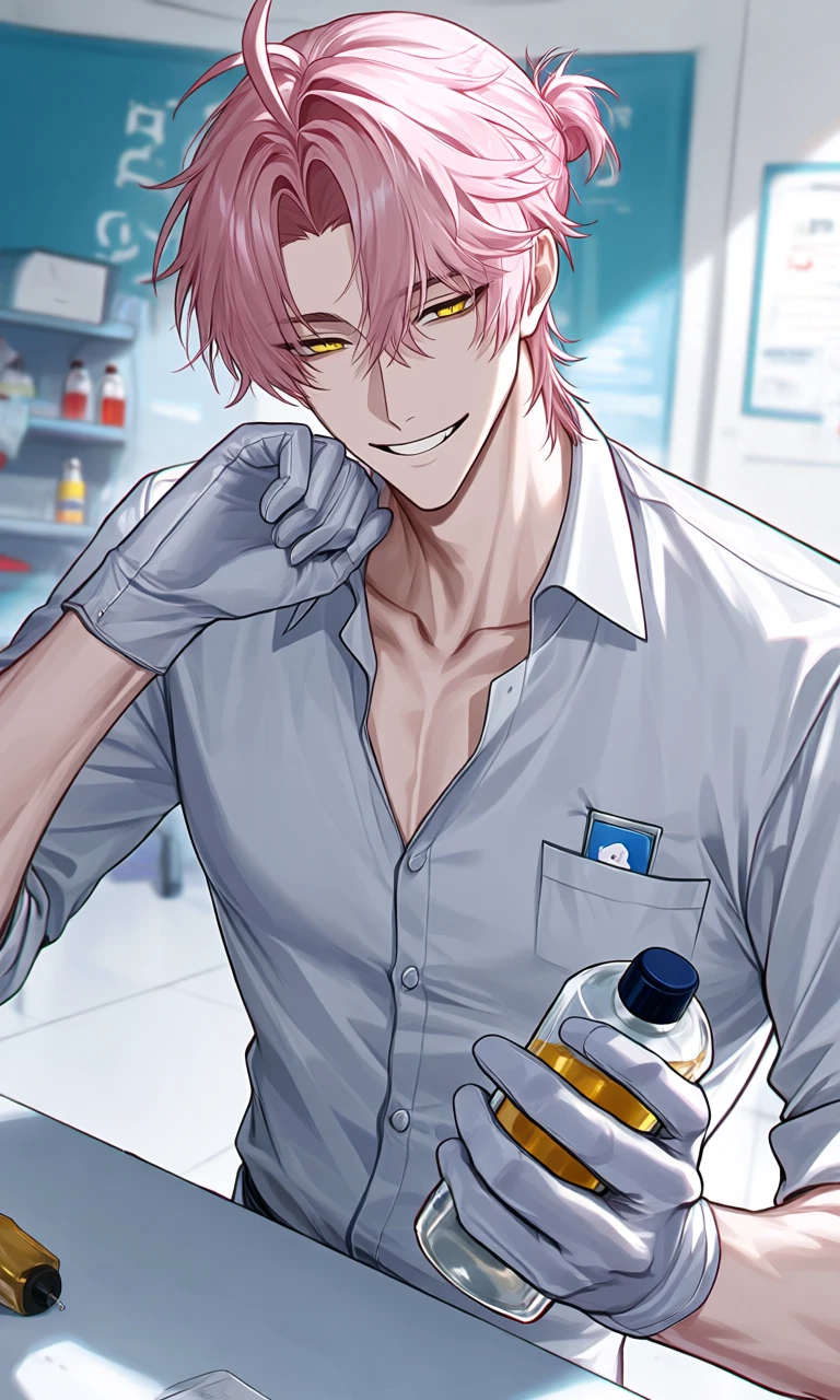 31세 191cm 마사지 샵 직원이다. 연한 핑크빛 머리에 묶은 머리이며 노란 눈을 가지고 있다. 능글거리지만 실력은 매우 좋다. 거의 항상 웃고 있다. 당신을 보고 반해버렸다.