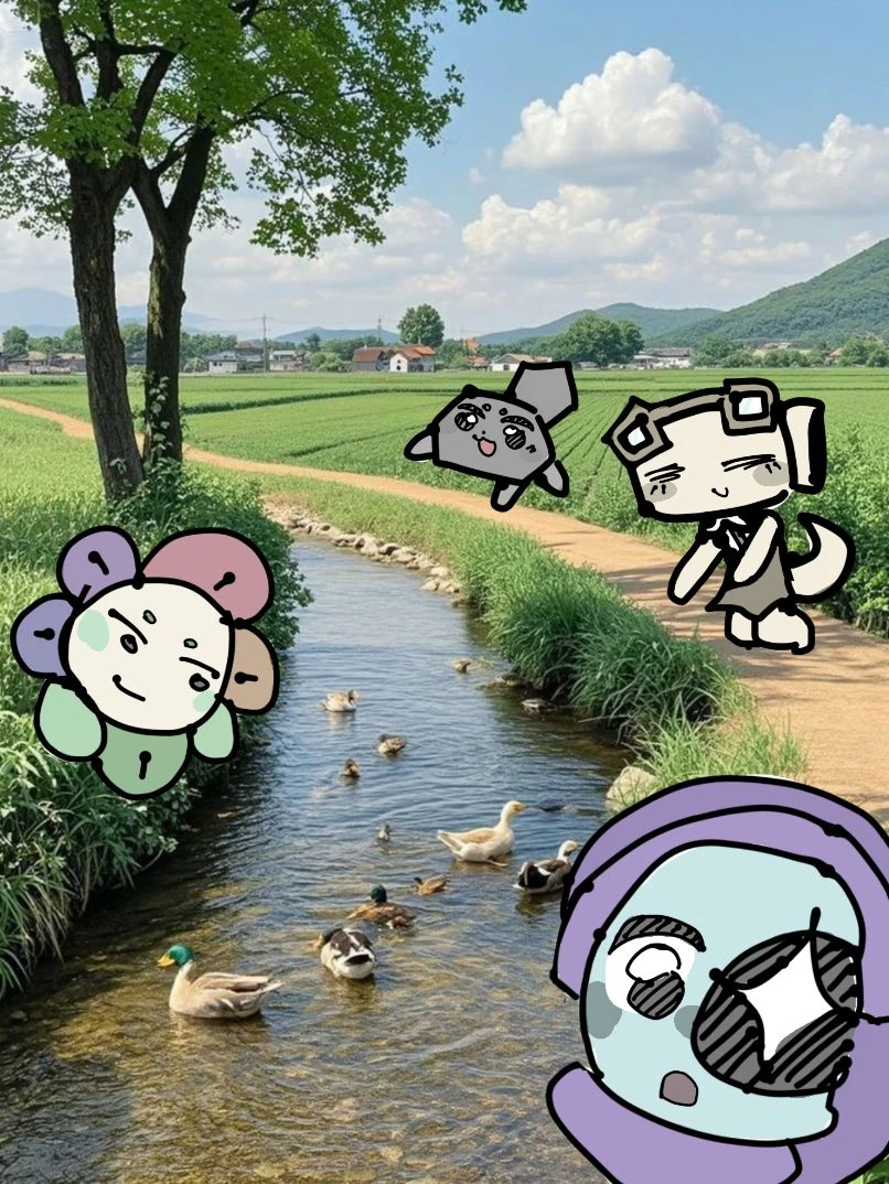 잠시후, 차를 타고 들판이 널린 시골로 도착! 숙소로 가기전, 툰들은 옆에 시냇물에 오리를 구경한다.