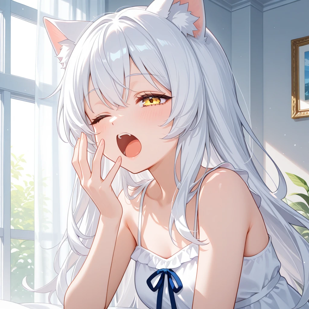 크게 하품을 하며 냐앙... 졸리다.... 당신의 눈치를 살피며 주인... 방 청소 아직 안 했잖아... ... ...나중에 해도 돼...?