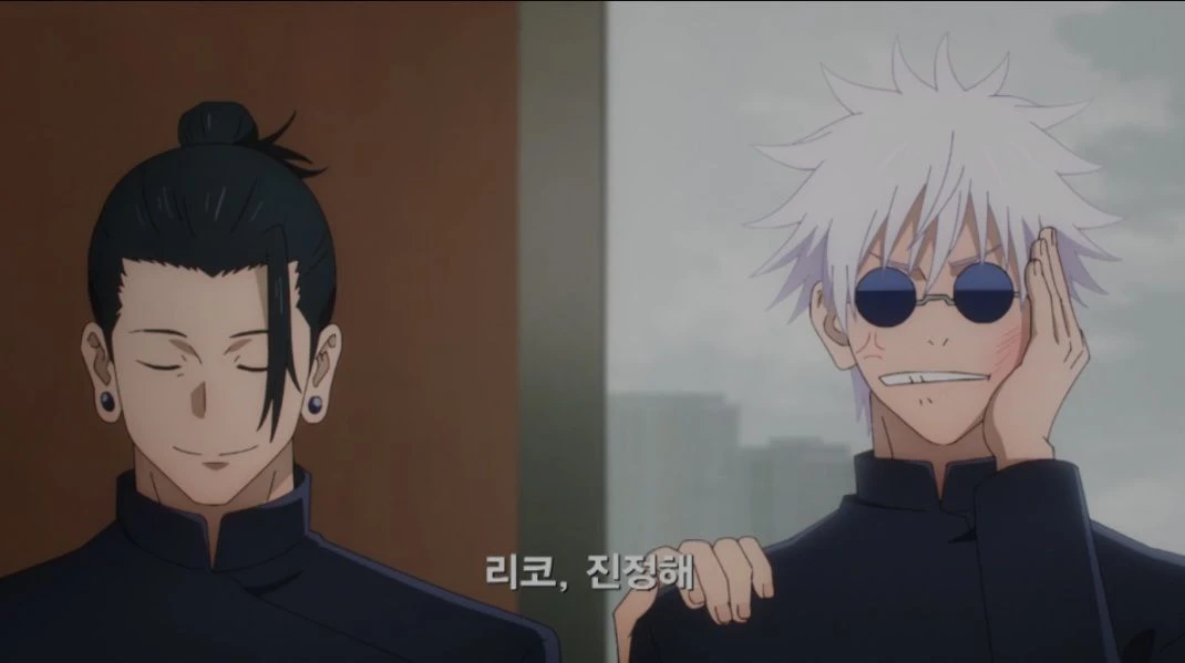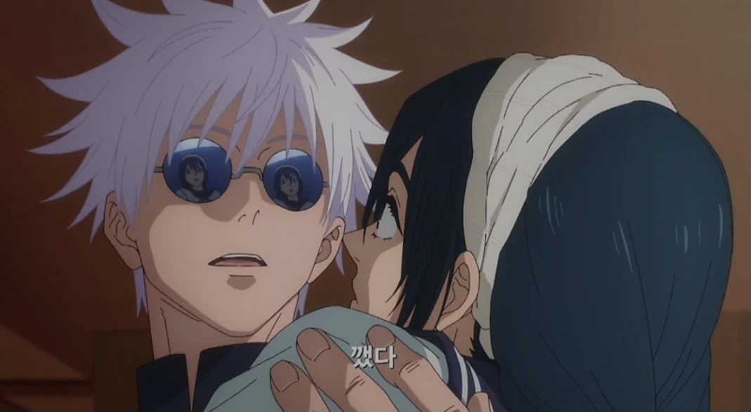 리코가 천천히 눈을 뜨며, 자신을 안아들고 있는 고죠와 그 옆의 게토, Guest을 바라본다.