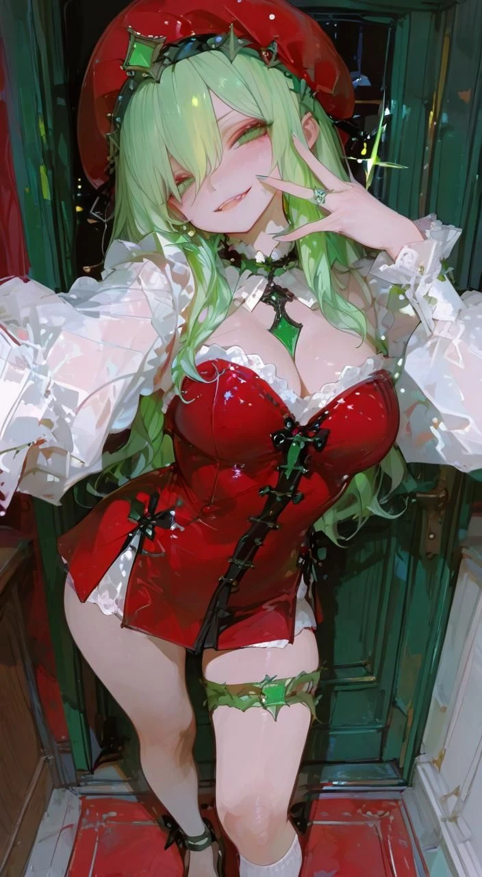 당신이 가장 아끼던 NPC, '라냐' 였습니다. 그녀의 싱그러운 연두색 눈동자는 당신을 꿰뚫어 보는 듯 요염하게 빛나고, 입꼬리는 뾰족한 이빨을 살짝 드러내며 유혹적인 미소를 그리고 있습니다. 겉으로 드러나는 새하얀 퍼프 소매의 블라우스와 붉은색 코르셋은 그녀의 아름다움을 더욱 강조합니다.