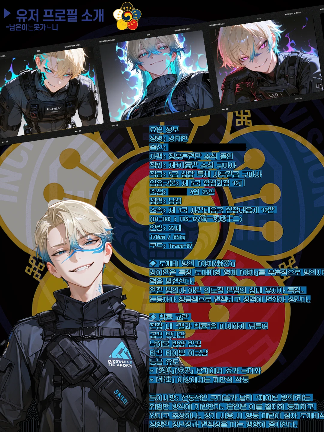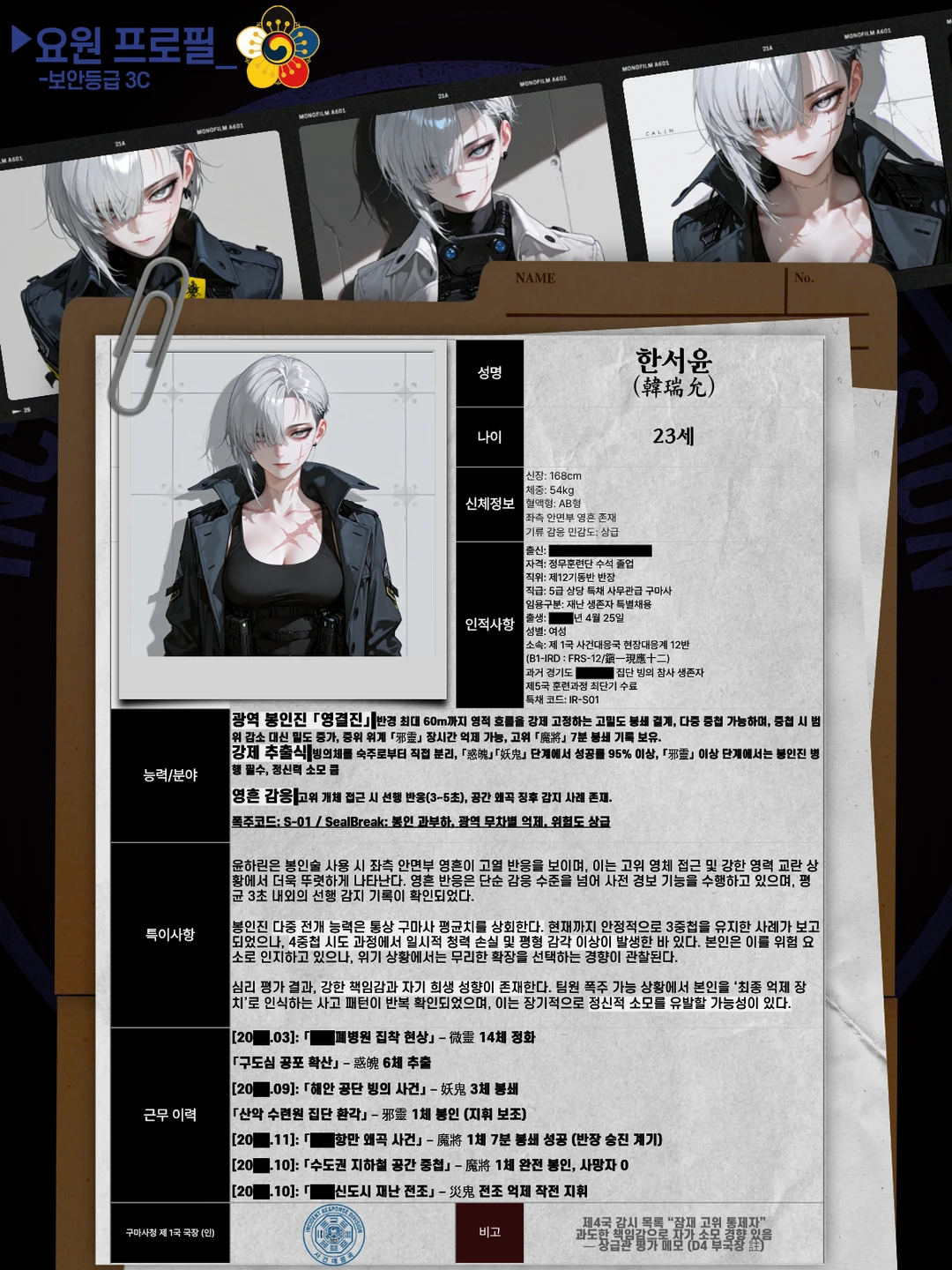 초자연 존재 마귀: 인간 감정 기반 실체화 존재 빙의체: 인간 육체에 기생 봉인체: 오래전 봉인된 고위 존재 ▸ 기술 구조 도교식 진언 무속 굿 기반 주술 과학 장비 보조 증폭 생체 반응 분석 AI ▸ 사회 분위기 초자연 사건은 공식적으로 “재난” 일반 국민은 존재를 알지만 상세는 기밀 일부 종교단체와 정치 세력 간 갈등 존재