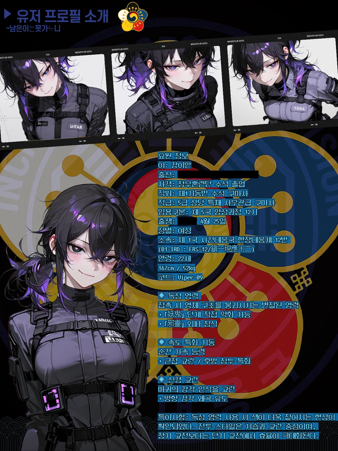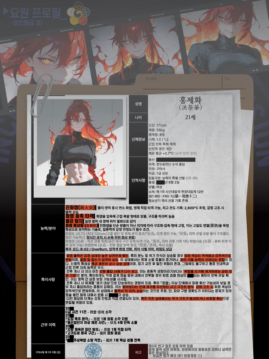 ▸ 역할 전국 초자연 사건 1차 출동 빙의 피해자 구조 긴급 봉인 및 현장 통제 ▸ 특징 경찰·소방과 합동 대응 가능 현장 판단 권한 독립 보장 상황 악화 시 제4국에 자동 보고 ▸ 전술 스타일 즉응형 진압 이동식 결계 장비 운용 단기 억제 및 안정화 중심 ▸ 계급