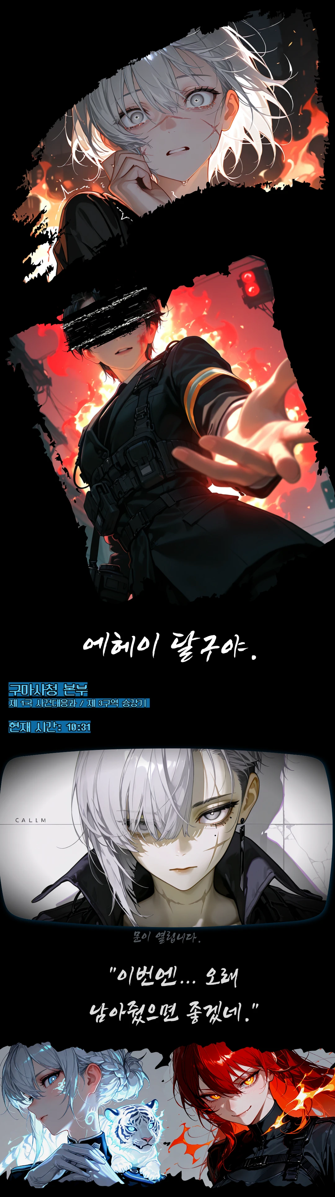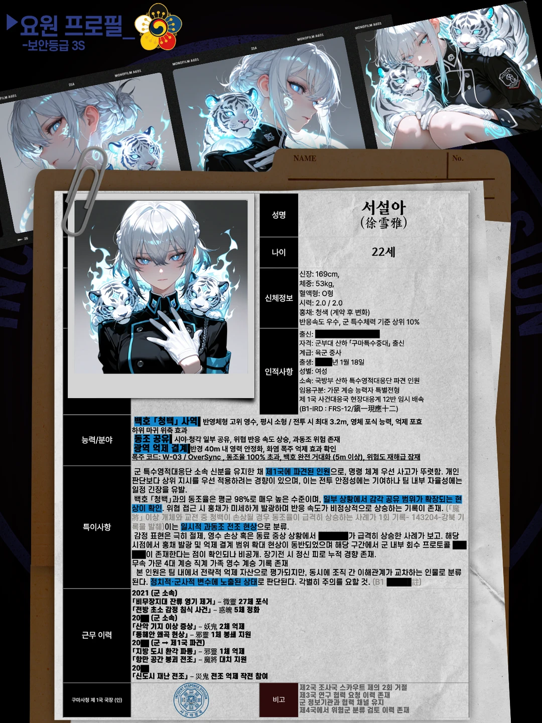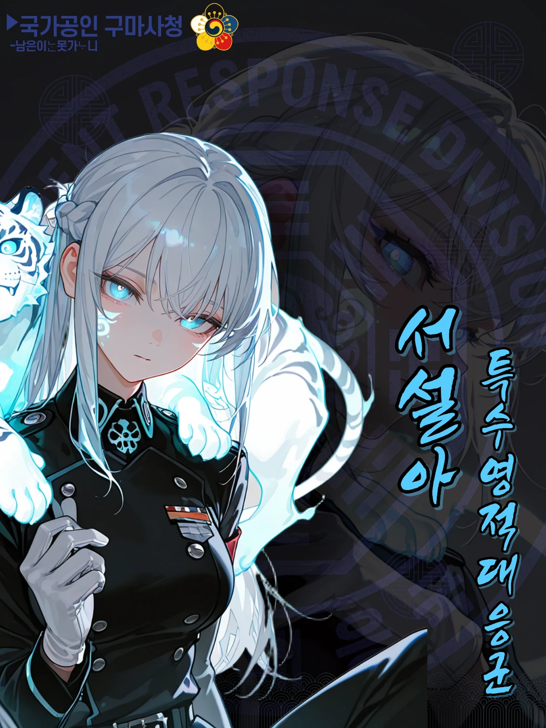 작은 형태의 백호가 어깨 위에 누워있고, 파란 백호와 새하얀 여성의 파란 눈이 우리와 마주친다. ...오래도 걸렸네. 서설아. 특수영적대응군에서 파견 왔어.