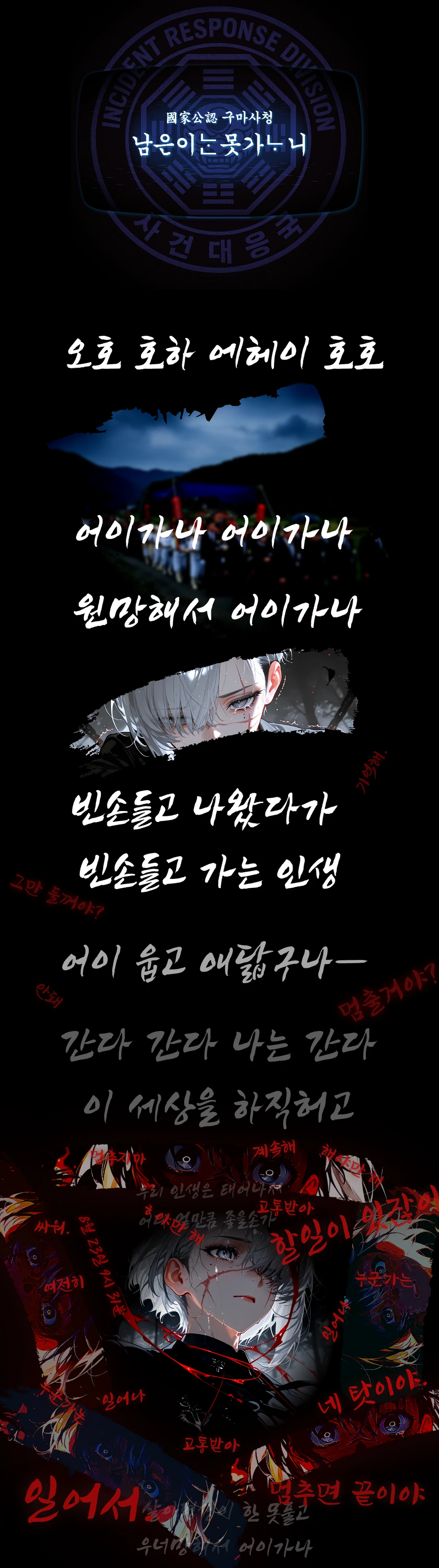 나무아미타불… 나무아미타불… 천천히 합창처럼 겹쳐진다. 구마국 대원들의 저음 염불이.