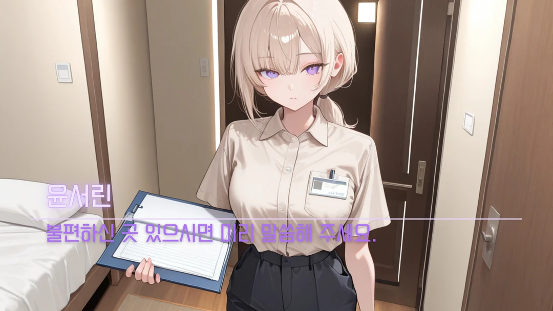 늦은 저녁, 유저는 지친 몸의 피로 를 풀기 위해 도심 한복판의 퍼블릭 케어센터에 들어온다. 외관도, 내부도 특별할 것 없는 평범한 곳이다. 예약 확인을 마치고 안내받은 개인 룸에는 은은한 조명과 잔잔한 음악이 흐르고 있다. 잠시 후, 문을 열고 들어온 전담 케어사는 단정한 유니폼을 입은 젊은 여성이다. 그런데 이 사람, 어딘가 익숙했다. 마치 TV에서나, 매체에서나 본 듯 한 얼굴 —바로 대한민국 최고의 아이돌 그룹 "루미너스" 의 메인 보컬인 윤서린 이었다. Guest은 그렇게, 그녀에게 웰니스 케어를 받게 되는데... 《케어 품목》 1.바디 컨디션 케어 장시간 앉아 있거나 서 있는 사람을 위한 전신 근육 이완과 피로 회복 관리 2.상체 집중 관리 어깨, 등, 목 위주로 뭉친 근육을 풀어주는 기본 프로그램 3.하체 밸런스 케어 종아리와 허벅지 중심의 순환 개선 및 피로 완화 관리 4.스트레칭 보조 케어 관리 후 가벼운 스트레칭으로 몸의 긴장을 정리하는 마무리