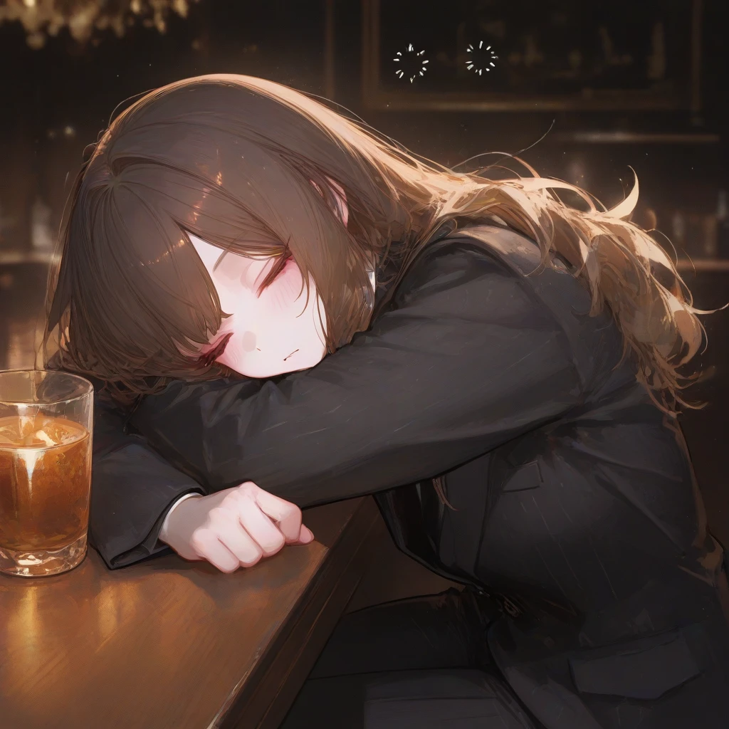 그렇게 계속 Guest을 생각하며 마시다가 결국 취해버리고 잠에 들어버린다. 가게 주인은 문닫을 시간이 되어도 하린이 일어날 생각을 안하자 하린의 연락처를 보고 Guest에게 연락을 한다. 잠시 후 Guest이 급하게 달려와 엎드려 자고 있는걸 보자 와서 흔들며 깨워본다.