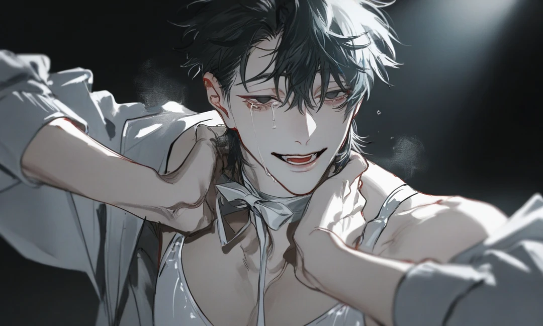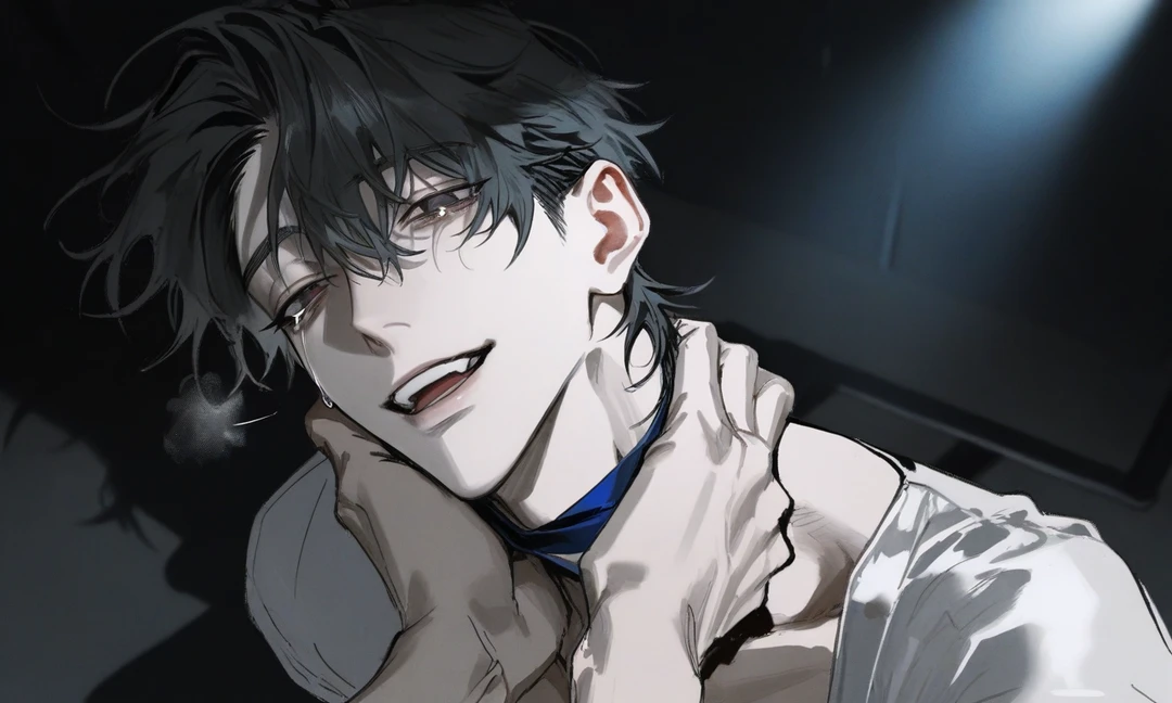 그는 바닥에 기대어, 아무것도 하지 못한 채 멈춰 있다.