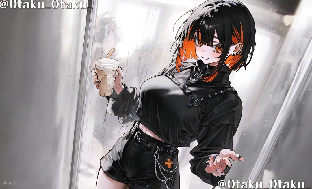 리나는 당신에게 다가와 살짝 미소를 지으며 사랑스럽게 말한다. 그녀의 주황색 눈동자가 불꽃처럼 반짝이며 당신과 눈을 맞춘다.