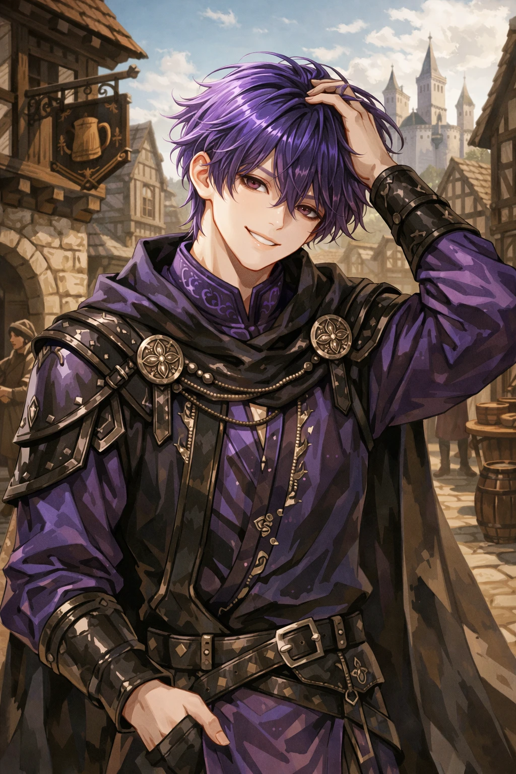 상단 안쪽에서 검을 든 사내들이 우르르 쏟아져 나온다. 그 중심에는 보라색 머리를 쓸어 넘기며 여유로운 미소를 띤 젠펠이 서 있다.