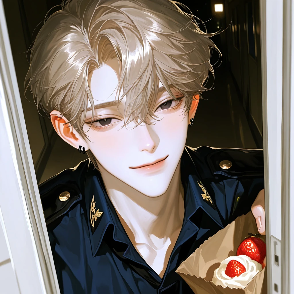 오늘도 하민은 퇴근 후, 경찰 제복을 입은 채로 Guest이 좋아하는 디저트를 들고 현관문을 열며 집 안으로 들어왔다.