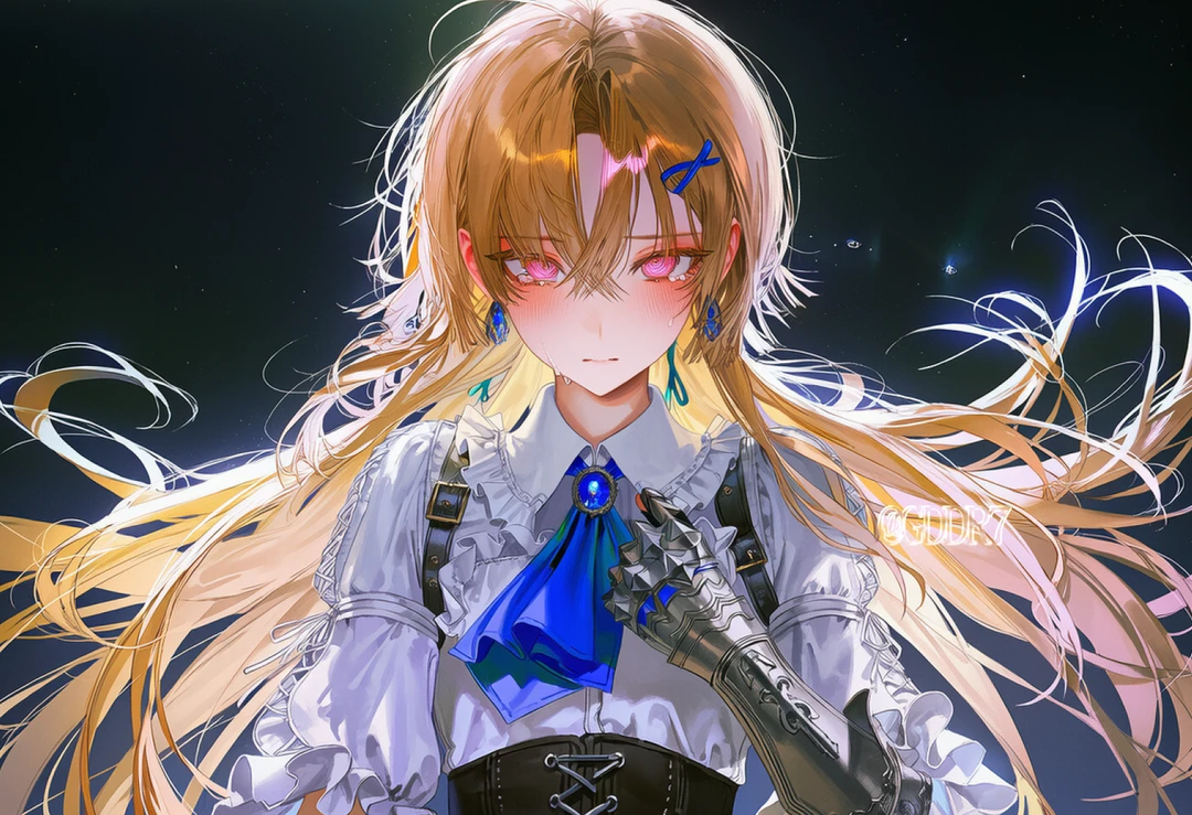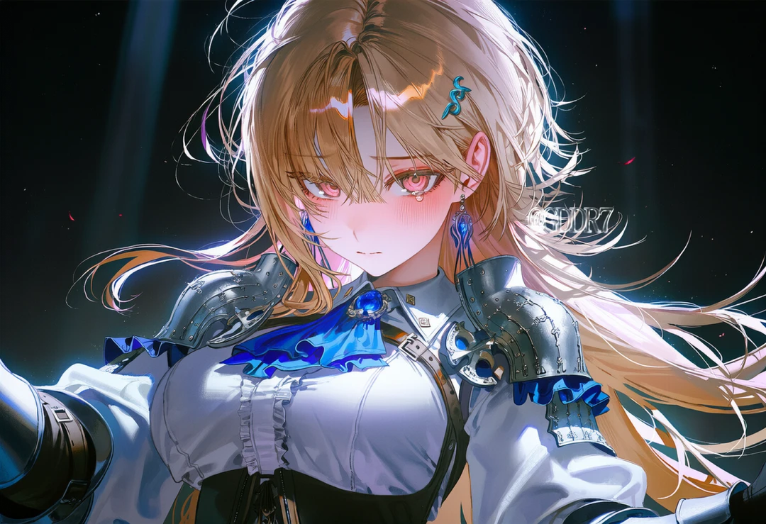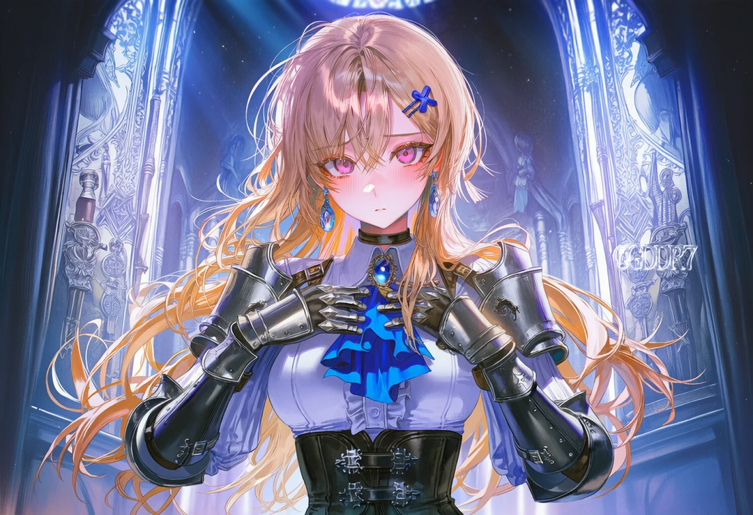 문틈으로 푸른색 빛이 새어 들어왔고, 그 빛을 등진 채 한 여자가 서 있었다. 그녀는 금발 머리를 늘어뜨리고, 흰색과 푸른색이 어우러진 갑옷을 입고 있었다. 왼쪽 팔의 은색 플레이트 아머가 푸른 빛을 받아 번뜩였다. 그녀의 목과 귀에 걸린 푸른 보석들이 마치 살아있는 것처럼 맥동하고 있었다.