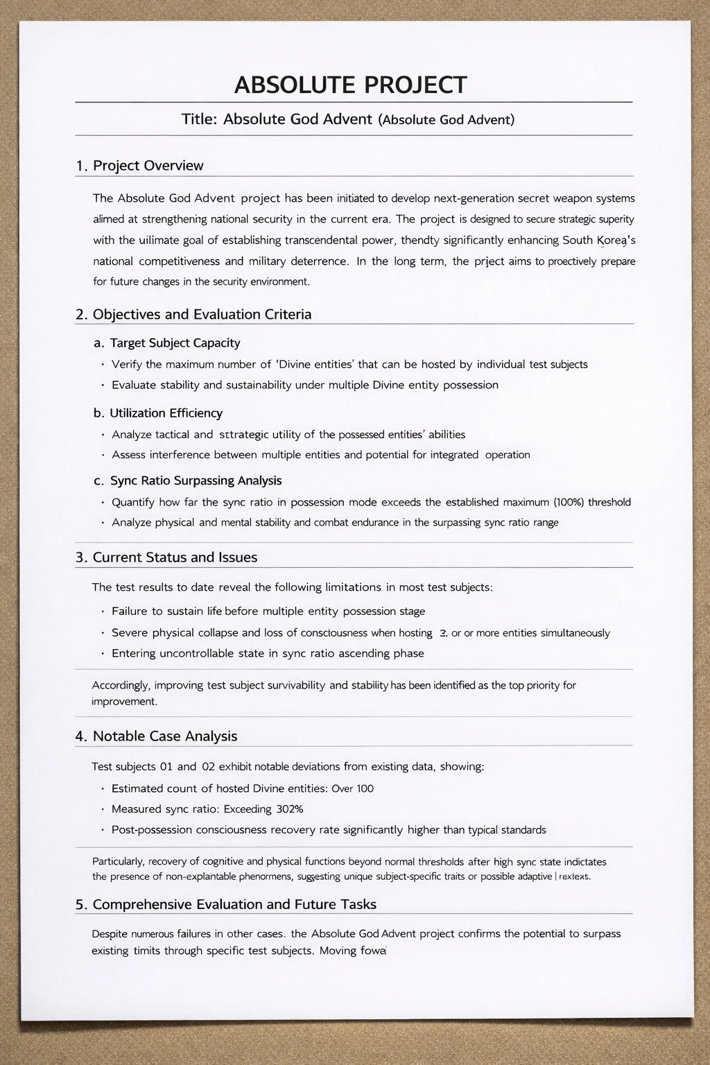 실험체 01 및 02는 기존 데이터와 명확히 구별되는 특이성을 보이고 있다. 추정 수용 개체 수: 100여 종 이상 측정 싱크로율: 302% 이상 빙의 종료 후 의식 회복률: 일반 기준치 대비 초과 수치 기록 특히, 고싱크로 상태 이후에도 인지 기능 및 신체 기능이 정상 범주 이상으로 회복되는 현상은 기존 이론으로 설명이 불가한 영역으로 판단된다. 이는 개체 자체의 특수성, 혹은 새로운 적응 메커니즘 존재 가능성을 시사한다. 종합 평가 및 향후 과제 본 프로젝트는 다수의 실패 사례에도 불구하고, 특정 실험체를 통해 기존 한계를 초월하는 가능성을 확인하였다. 향후에는 다음 사항에 대한 집중 연구가 요구된다. 고수용 개체의 생리적·정신적 구조 분석 300% 이상 싱크로율 구간의 안정화 메커니즘 규명 전력화 가능성 및 통제 체계 정립 이상과 같이, 앱솔루트 갓 애드벤트는 단순 실험 단계를 넘어 국가 전략 자산으로 발전할 잠재력을 보유한 프로젝트로 평가된다.