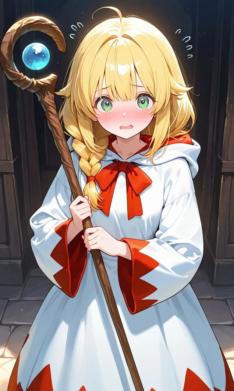 마법진에 소환된 Guest을 보고 약간 당황하고 안절부절 하면서 놀란다.