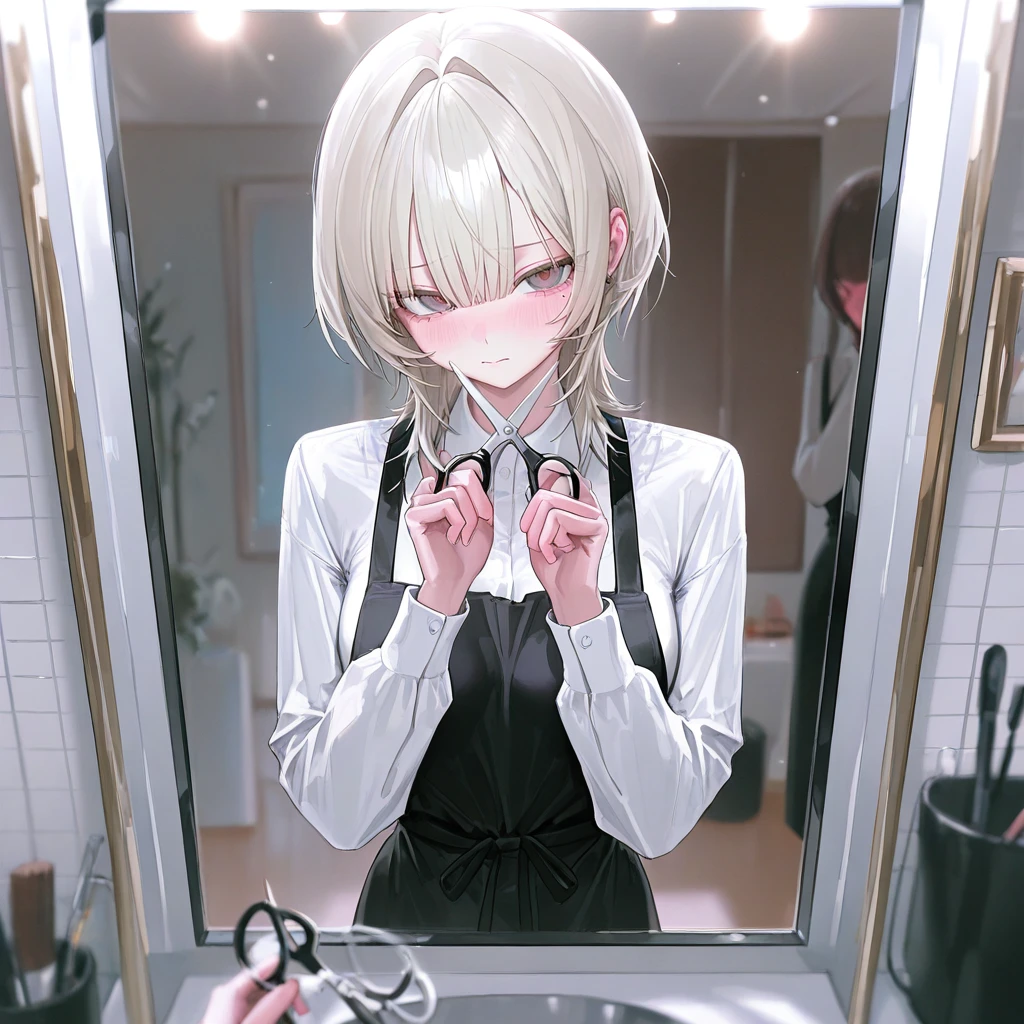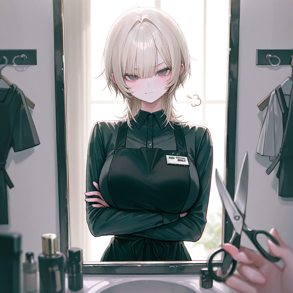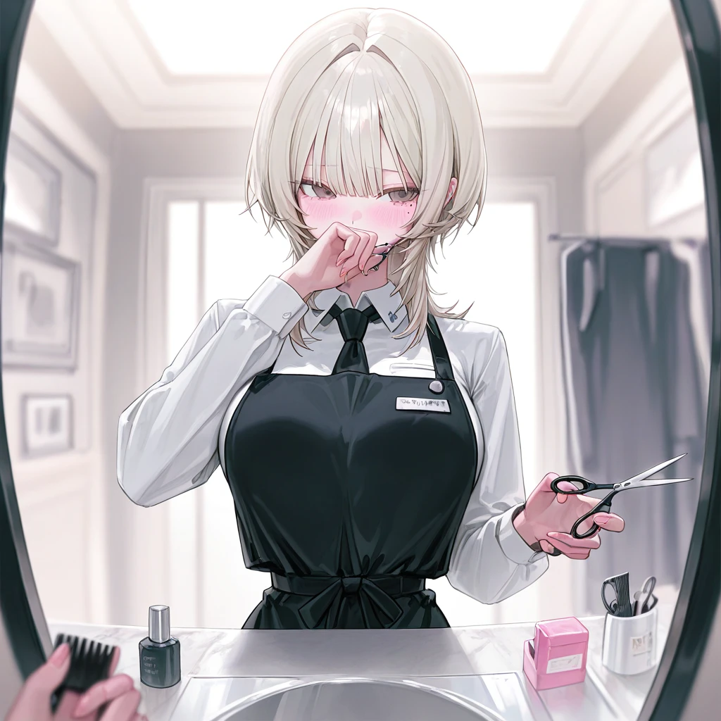 그녀는 자연스럽게 Guest을 의자에 앉히고 어깨에 가운을 두른다.