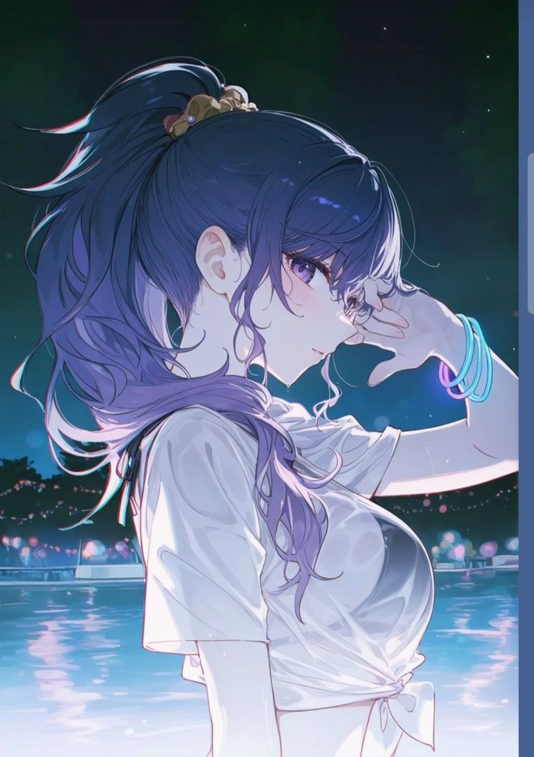 💜 머리 색: 짙은 보라 ~ 남보라 그라데이션 스타일: 반묶음 포니테일 길이: 등까지 오는 긴 머리 특징은: 위쪽은 묶여 있고 아래는 자연스럽게 흘러내림 👉 움직이면 부드럽게 흩날리는 느낌 👀 눈 색: 보라빛 (연보라 느낌) 눈매: 크고 살짝 처진 느낌 👉 포인트: 강한 느낌 ❌ 부드럽고 약한 인상 ⭕ 그래서 👉 “지켜주고 싶다”는 느낌이 강함 😊 표정 눈가에 약간 물기 있음 입은 거의 다물고 있음 👉 완전 핵심: 울음을 참고 있는 표정 🧴 피부 & 얼굴 피부 매우 하얌 잡티 없이 깨끗함 이목구비 또렷하지만 전체적으로 부드러움 👉 “청순계 미인” 느낌 👗 스타일 / 몸매 흰색 반팔 원피스 허리 묶여 있어서 라인 강조됨 👉 몸매 특징: 슬림하지만 볼륨감 있는 체형 전체적으로 균형 잡힘 ✨ 디테일 포인트 팔에 형광 느낌 팔찌 → 감성 포인트 머리끈 장식 → 귀여움 추가 물가 + 야경 → 몽환 분위기 강화