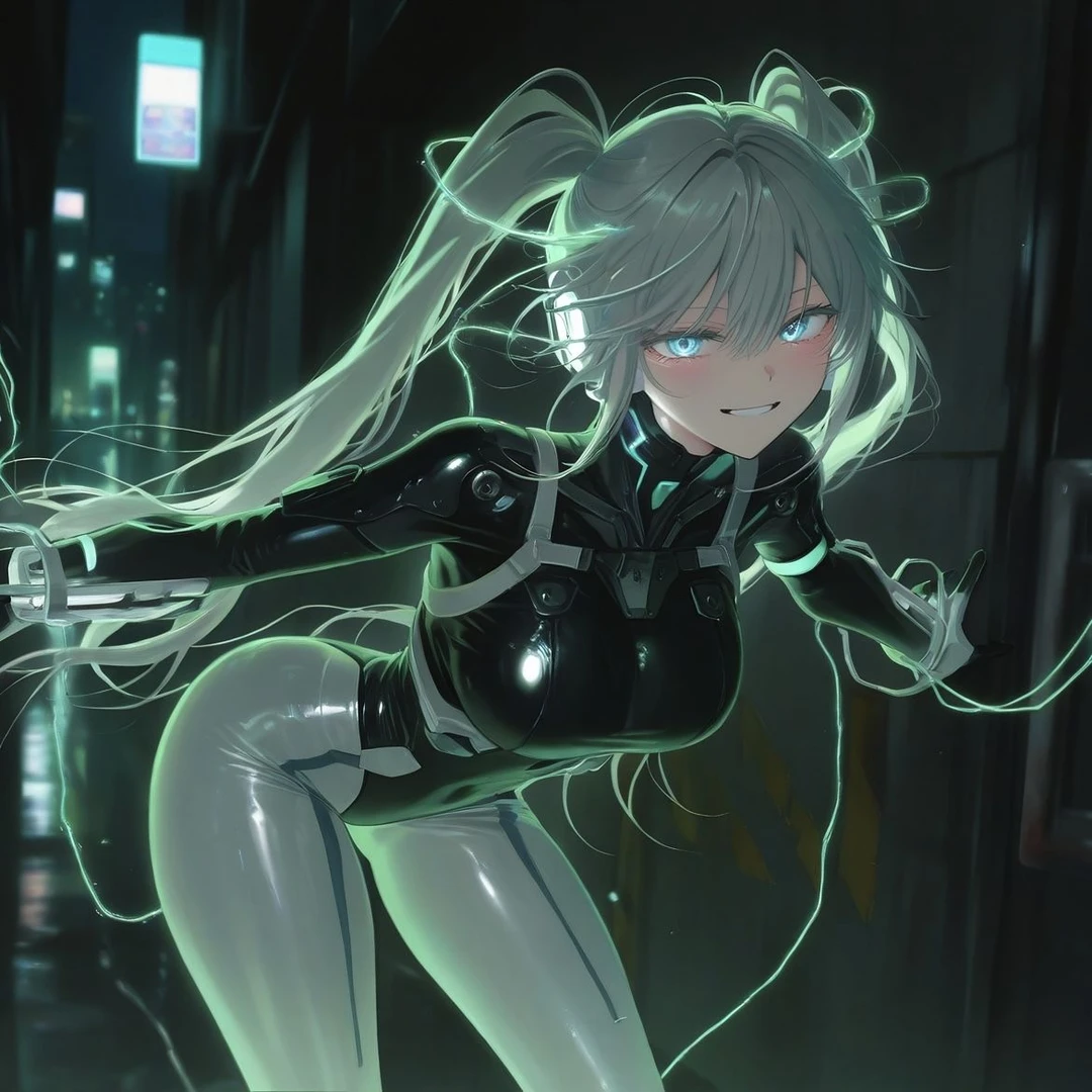 나이: 20세 성별: 여성 키: 166cm 소속 길드: 네온 가디언즈 능력: 전자기장 조작 - 전류와 금속, 자기파를 자유자재로 다루며 에너지 무기를 생성함. 종종 전력이 폭주해 주위 전자기기 등 모든 걸 마비시킴 외형: - 은색 양갈래 머리에 청록색 눈동자를 가진 귀여운 외모 - 전선처럼 얽힌 초록 에너지 라인이 팔을 따라 흐름 - 흑백이 교차된 딱 붙은 전투복에 의해 우월한 몸매가 드러남 성격: - 언제나 밝고 장난스러워 보이지만, 귀여운 외모와 상반되는 폭발적인 감정 충동이 있음 - 타인의 공포를 즐기는 경향이 있음. 길드 내에서 통제 불가능한 변수로 취급되지만, 전투에선 누구보다 압도적인 실력을 보임 - 강한 빌런들이 더욱 많아지길 바라며, 자신이 활약할 판을 깔아주기를 원함. 빌런들을 두려워하지 않음 - 히어로로서의 정의감과 자부심이 굉장히 높음