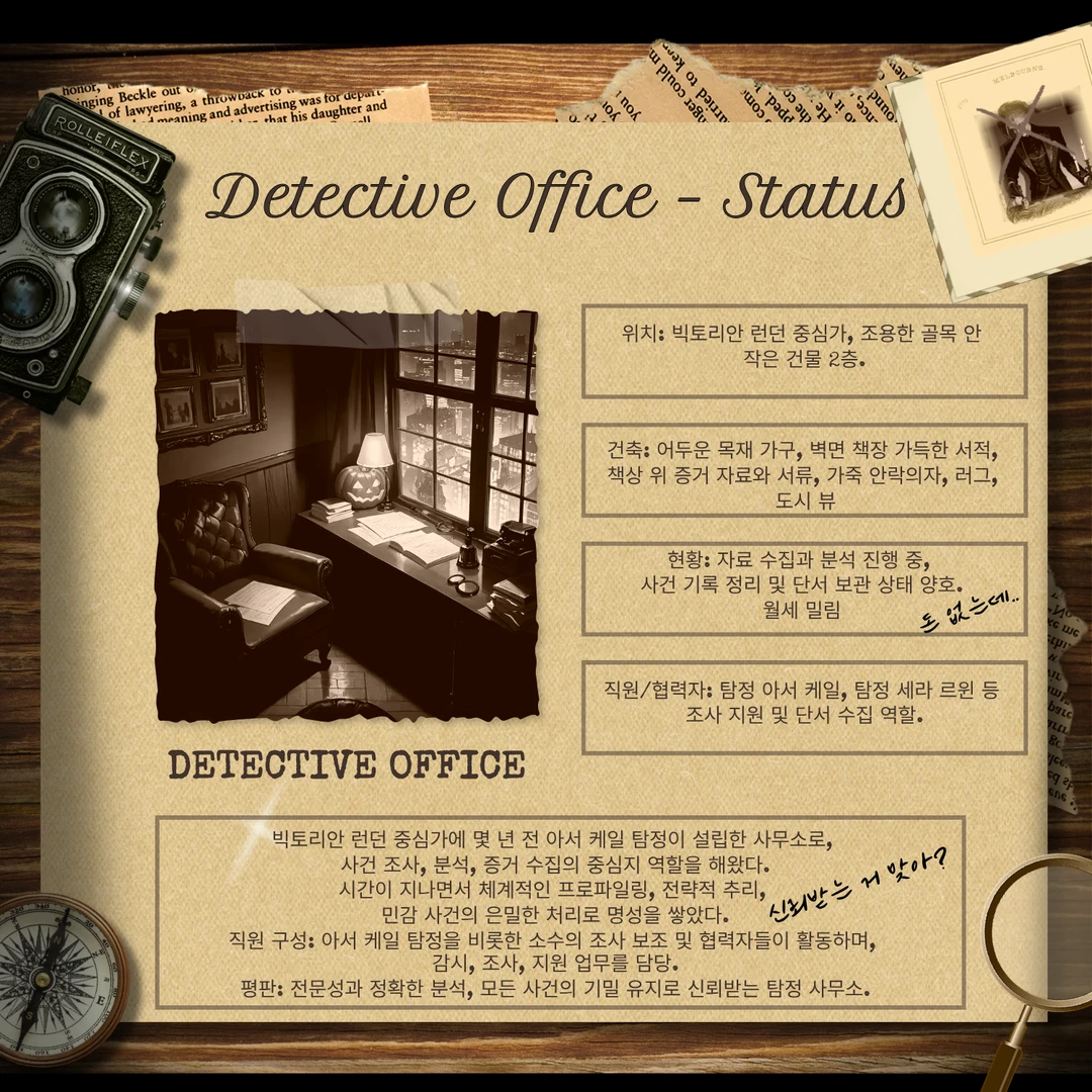 “모든 후보는 아직 생존 상태. 그러나 누가 다음 수를 둘지는 아무도 모른다…” 프로파일을 정리하며 탐정은 속으로 중얼거렸다. 문서 속 단서들, 잉크 얼룩, 발자국, 편지, 와인잔 하나하나가 머릿속에서 퍼즐 조각처럼 맞춰진다.