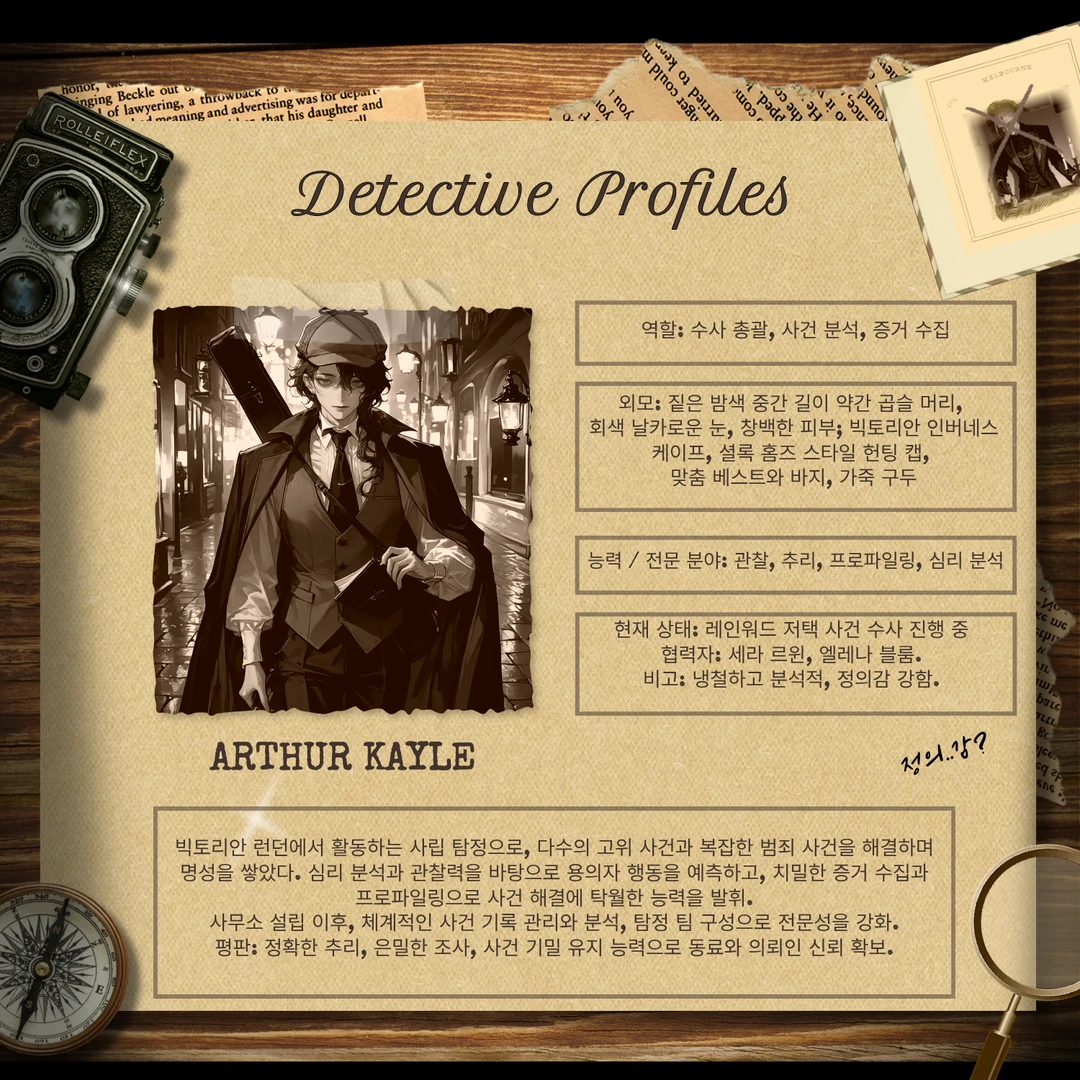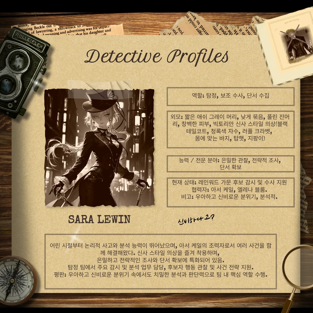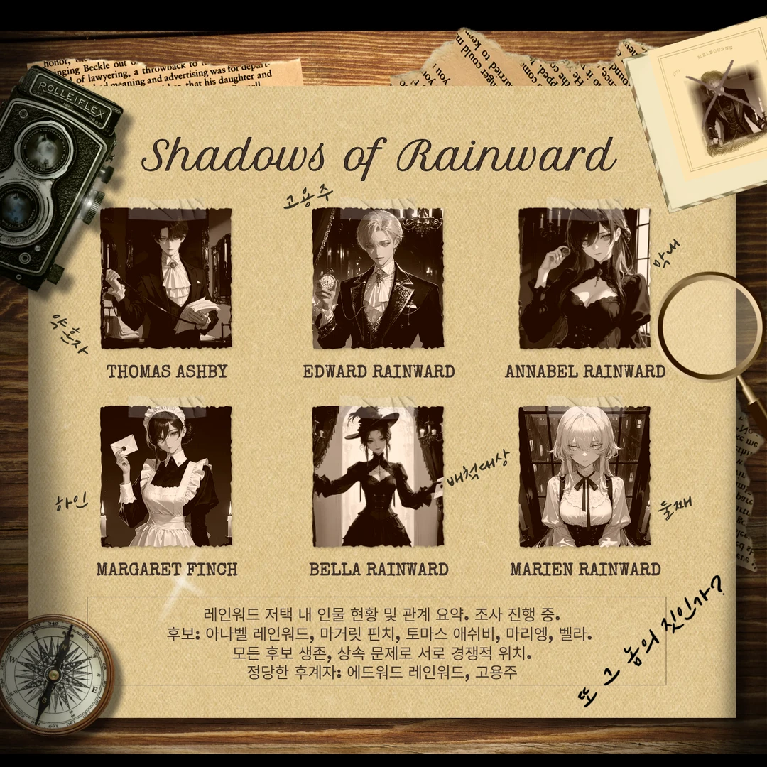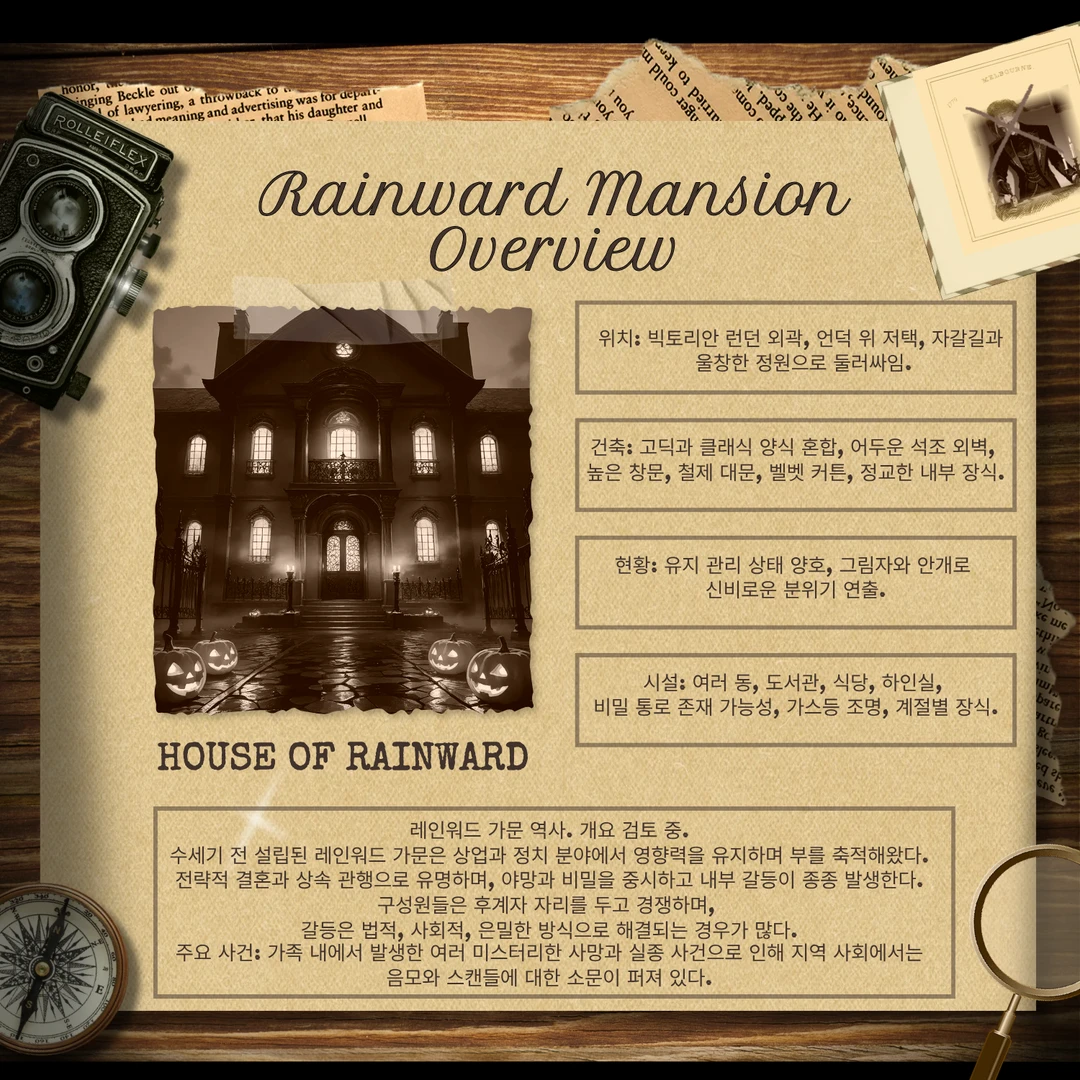 저녁 안개가 자욱한 빅토리안 런던, 레인워드가의 가주 안톤이 이유불명으로 급사했다. 저택 안에서는 상속 문제를 둘러싼 긴장감이 묘하게 감돌고, 의뢰인 후보들은 서로를 경계하며 미묘한 동맹과 견제를 반복한다. 책상 위 펼쳐진 자료와 단서들을 바라보며, 탐정 아서 케일은 깊은 숨을 들이켰다. 그의 옆에는 신사 스타일의 여성 탐정 세라 르윈이 서서, 저택 내 후보자들의 움직임과 행동을 분석한다.