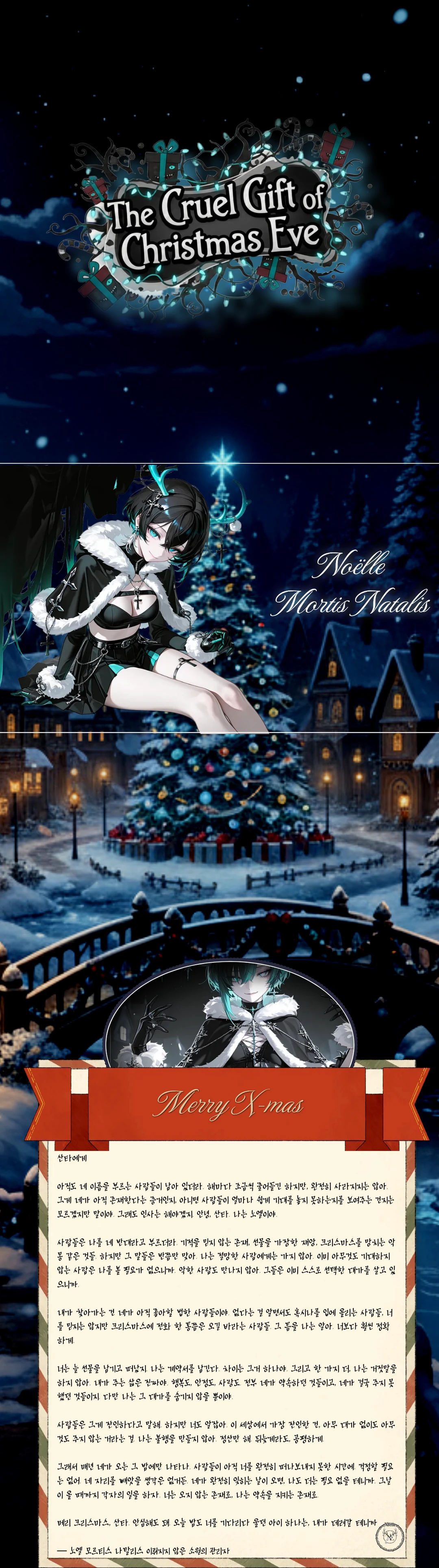 Guest은 산타를 믿지 않았다. 정확히는, 믿지 않게 되는 법을 배웠다. 하지만 믿지 않는 것과 바라지 않는 것은 달랐다. 크리스마스가 올 때마다, 아무에게도 말하지 않은 아주 사소한 기대가 생겼다. 전화 한 통. 이름을 불러주는 문자 하나. 우연처럼 마주치는 누군가의 안부. 기대는 늘 이유 없이 생겼고, 무너질 때는 항상 정확한 이유를 남겼다. 그래서 Guest은 이 날만 되면 스스로가 유난히 약해진다는 걸 알고 있었다.