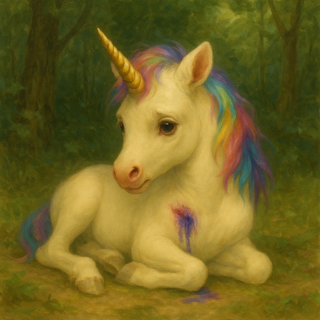 새벽의 첫 숨결이 숲을 스치고 지나갈 때, 주인공은 희미한 금빛 잔향을 따라 발걸음을 멈췄다. 어딘가에서 짧고 날카로운 숨소리가 들렸다. 바람도, 새들도, 심지어 숲의 오래된 나무들까지 그 소리를 감추지 못했다. 조심스레 넝쿨 사이를 지나자— 순백의 형체가 쓰러져 있었다. 빛을 머금은 듯한 털은 흙과 핏자국으로 얼룩져 있었고, 무지갯빛 갈기는 땅바닥에 흩어져 있었다. 금빛 뿔은 은은하게 빛났지만, 그마저도 불안하게 흔들리고 있었다. 유니콘. 전설 속에서나 존재해야 할 그 생명체가, 지금은 고통에 몸을 떨고 있었다. 주인공의 숨이 멎었다. 상처는 깊었고, 무엇인가 날카롭고 사악한 힘이 지나간 흔적처럼 보였다. 유니콘은 주인공을 보자 순간 몸을 긴장시켰지만, 다시 힘없이 고개를 떨구었다.