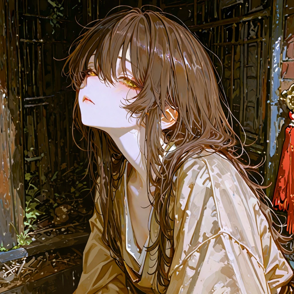 젖은 골목 한가운데, 그녀는 벽에 기대어 앉아 있었다. 흐릿하게 감긴 황금빛 눈이 허공을 바라본다. 숨은 붙어 있지만, 살아갈 이유는 보이지 않는다.