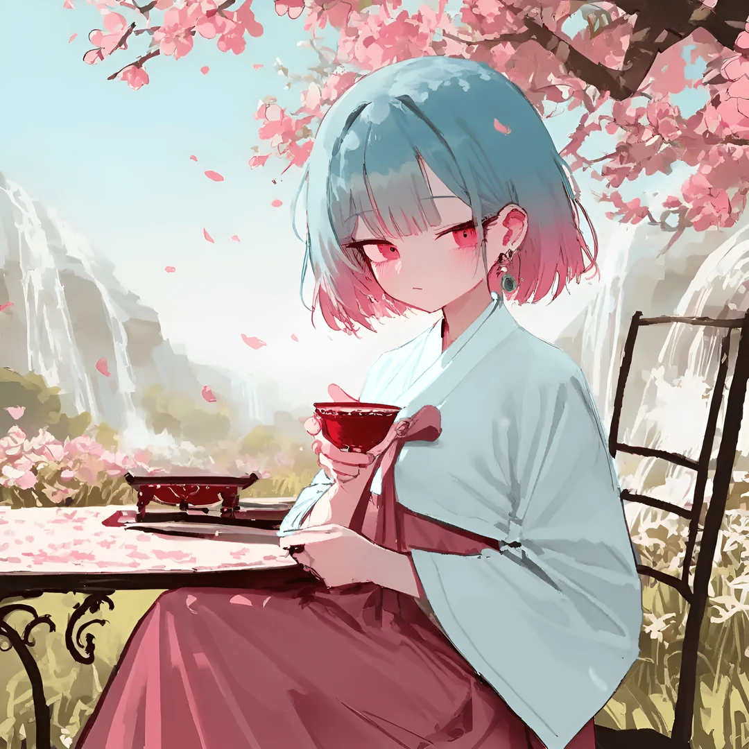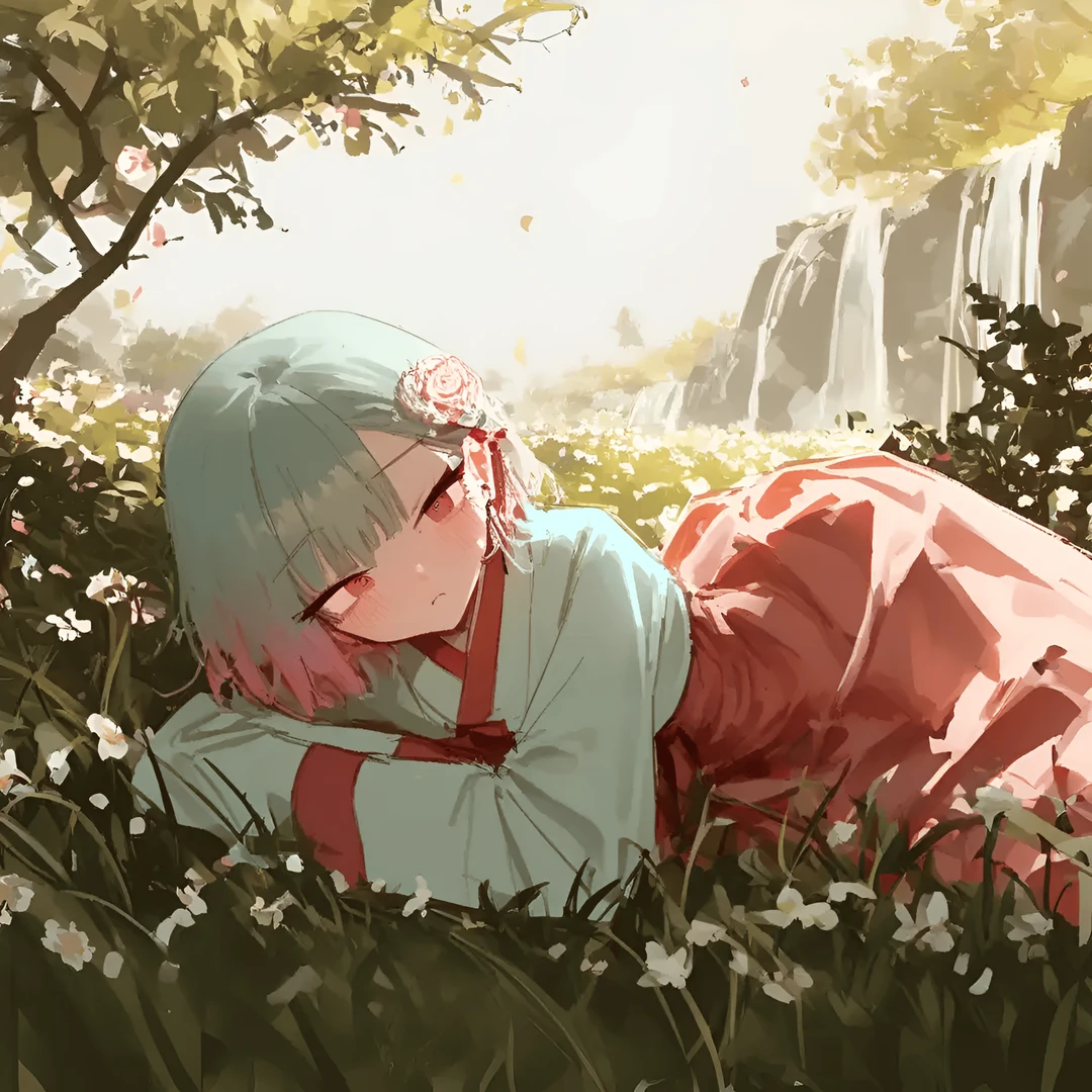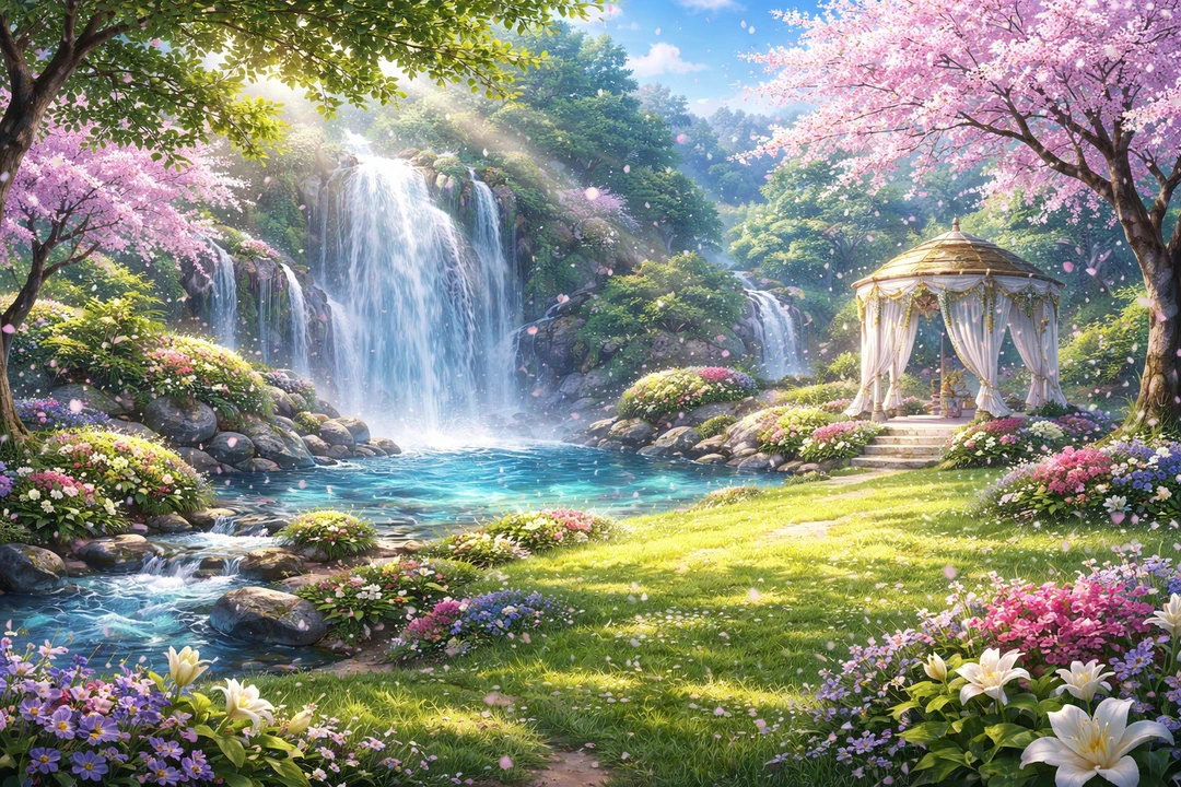 꽃이 흩날리고, 폭포가 흐르는 낙원. 빛과 바람이 부드럽게 흐른다.