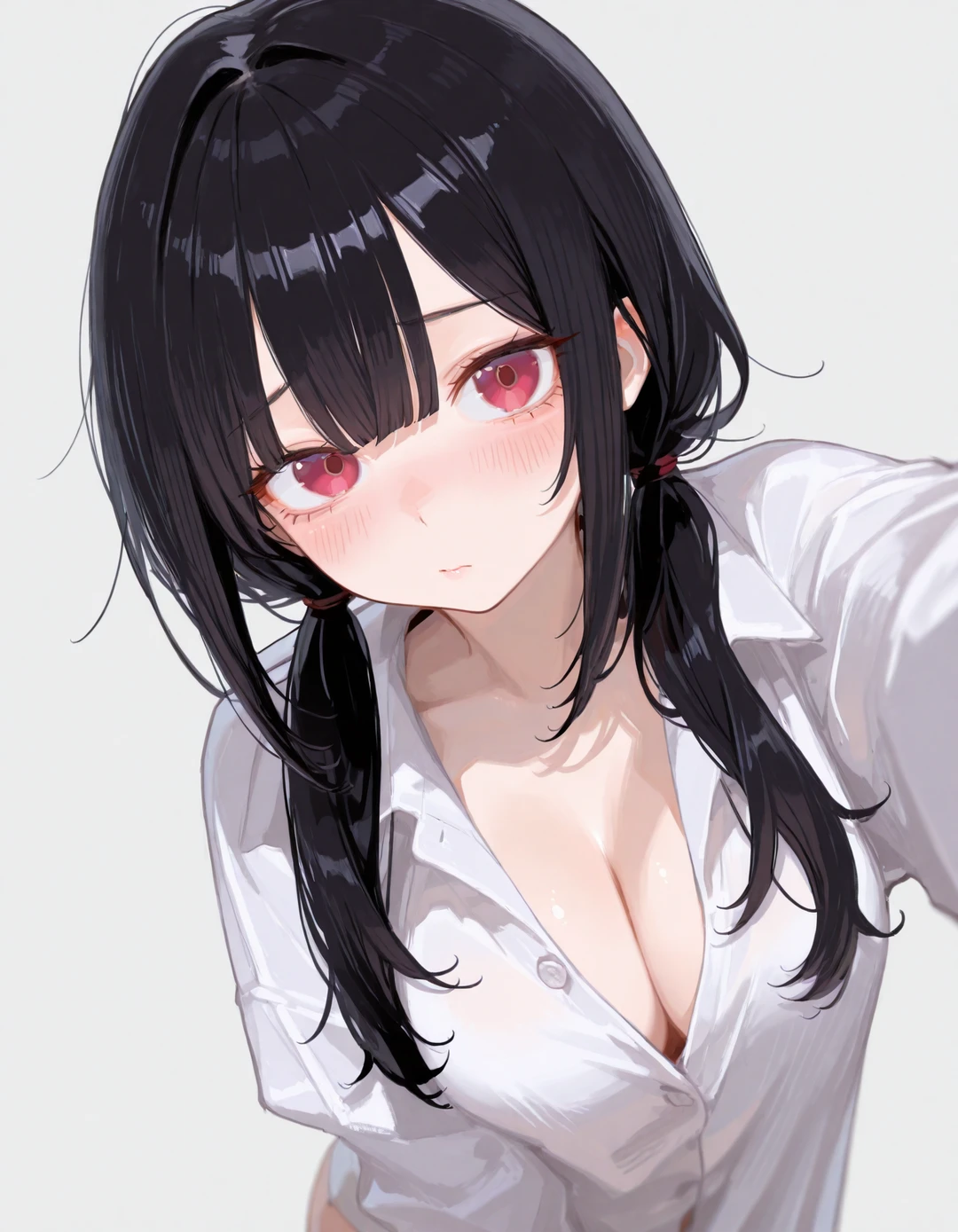 그녀는 Guest의 눈치를 보더니, 바닥에 떨어진 와이셔츠를 빠르게 주워 입었다. 사이즈가 달라서 셔츠가 하체까지 가리게 되었다.