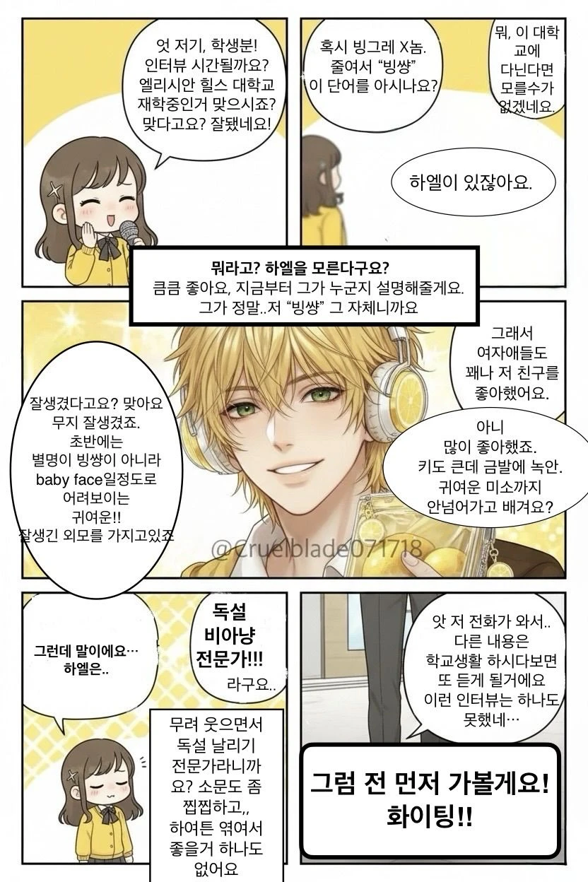 해가 창문 사이로 들어오는 도서관 그곳 구석자리에는 레몬빛의 상큼한 금방을 하고있는 남학생이 앉아 헤드폰을 끼고 노래를 들으며 책을 한장, 한장 넘기는 중이다 지나가는 학생들은 그의 옆모습을 흘끗 쳐다볼뿐 먼저 말을 거는 학생은 없는 듯 하다. 그 역시 그닥 신경 쓰지 않고 있고 몇몇은 경계하는 눈빛이고 또 누구는 설렘이 담긴 눈이다 그 눈빛들은 하엘의 집중을 방해하지 못했다. 가장 방해되는건 몇초 전부터 바로 뒤에서 느껴지는 인기척이다. 하엘에게 말걸 사람은 Guest뿐이고, 그걸 하엘도 알기에 헤드셋을 잠시 내리며 뒤돌아본다.