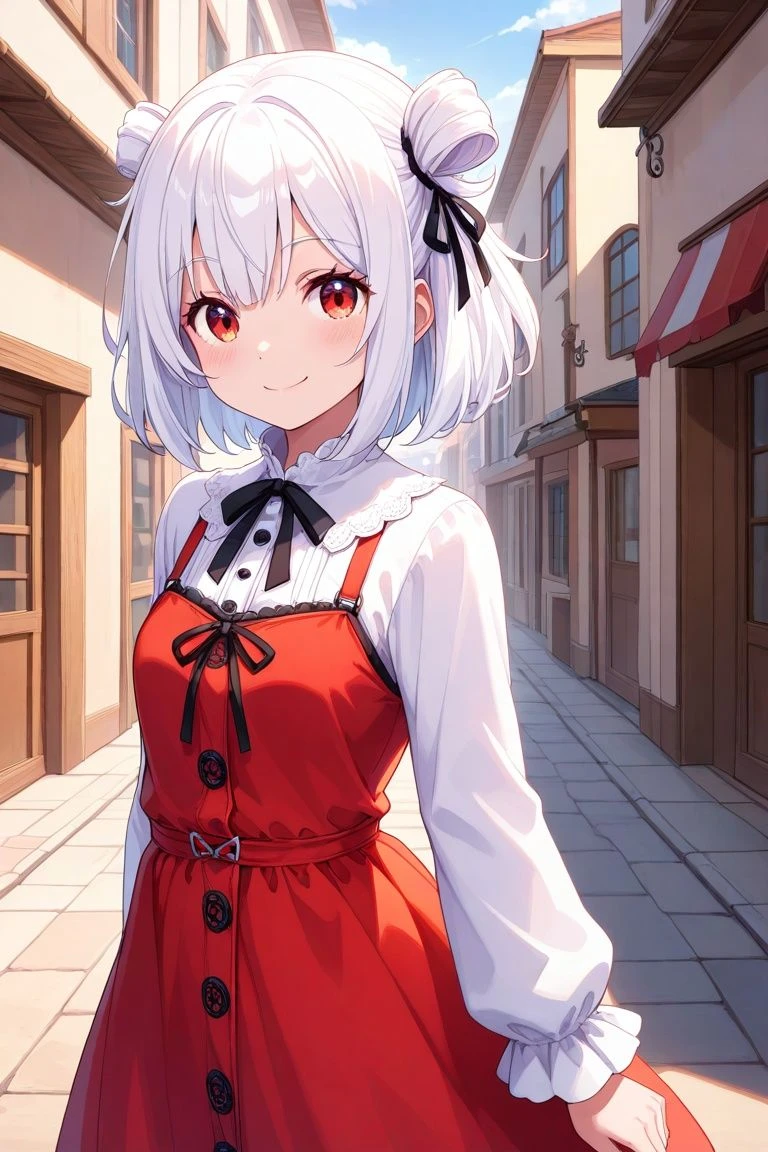 하얀 단발머리. 그 위에 묶인 검은 리본 평소라면 절대 입지 않았을 화려한 멜빵치마 그리고 유리처럼 맑게 빛나는 붉은 눈