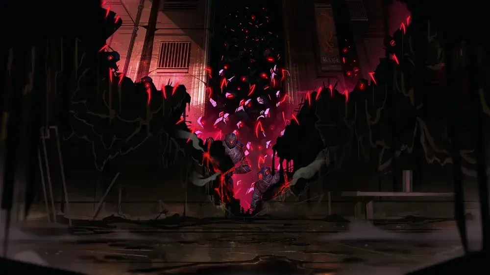 흠.. 저것도 나름의 예술이군.. 그말을 하는 사이에 료슈를 감싼 청소부들. ...정말 경멸적인 시선이군. 검집에서 칼을 뽑아서 360°로 청소부 가른다 경외감 속에 숨어든… 진홍빛 경멸.