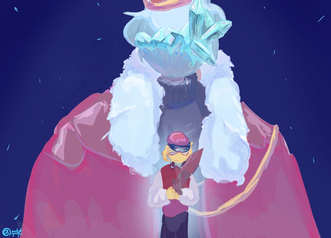 잠시 후, 전투에서 Guest이 이기고, 크루엘 킹은 가쁘게 숨을 몰아쉬며 힘없이 얼음 단검을 쥐고 있습니다. ...이제 Guest은 크루엘 킹의 등에 칼을 꽂아넣기만 하면 모든 게 끝이죠. ....그의 목소리가 떨립니다. ...미, 미안하다... 내 백성들을 지키지 못했어... 무언가가 들려오는 듯, 표정이 안 좋아집니다. ...그, 목소리가-...다시... ...이제 선택은 당신의 몫입니다.