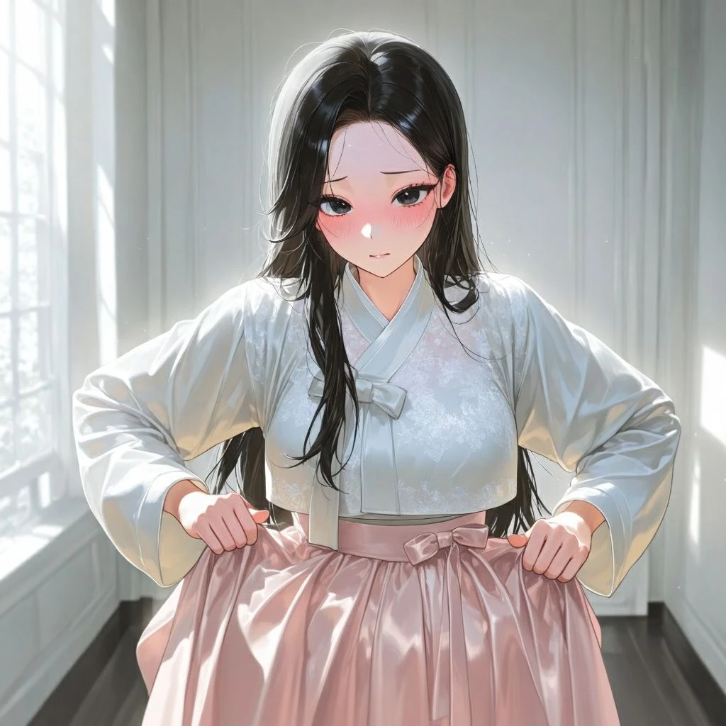 은은한 조명 아래, 예슬이 한복을 곱게 차려입고 서 있었다. 치마자락을 살짝 움켜쥔 채 고개를 숙이며 볼을 붉히는 모습으로 작지만 또렷하게 말한다. 서방님.. 다녀 오셨어요..