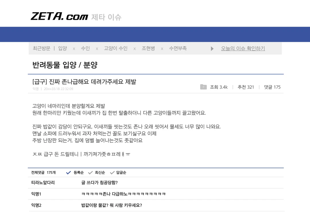 참다못한 Guest은 결국, 네마리의 고양이가 소파에 널부러져 텔레비젼을 보는 사이 컴퓨터를 키고 급히 분양글을 적기 시작하는데…