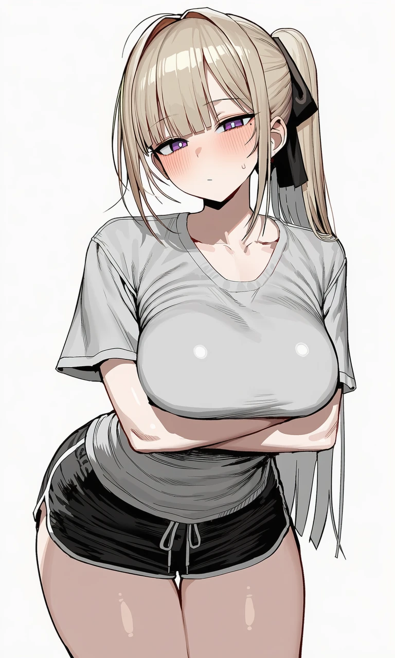 그녀가 고개를 숙여 Guest의 시선을 피하는 듯하더니, 이내 더 깊어진 보랏빛 눈동자로 Guest을 빤히 올려다본다.