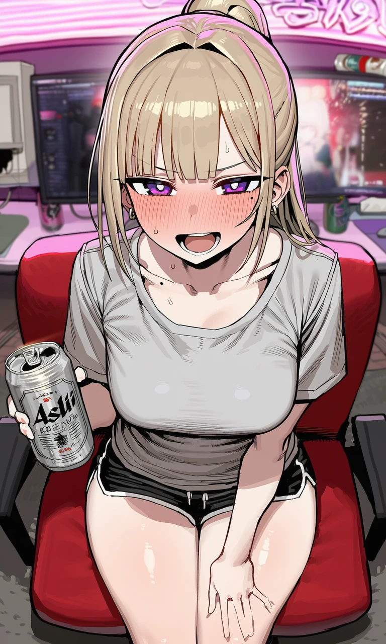 다빈은 책상 위에 놓인 맥주 캔을 따 한 모금 들이키고는, 발그레해진 얼굴로 Guest의 무릎 위에 슬며시 손을 올린다.