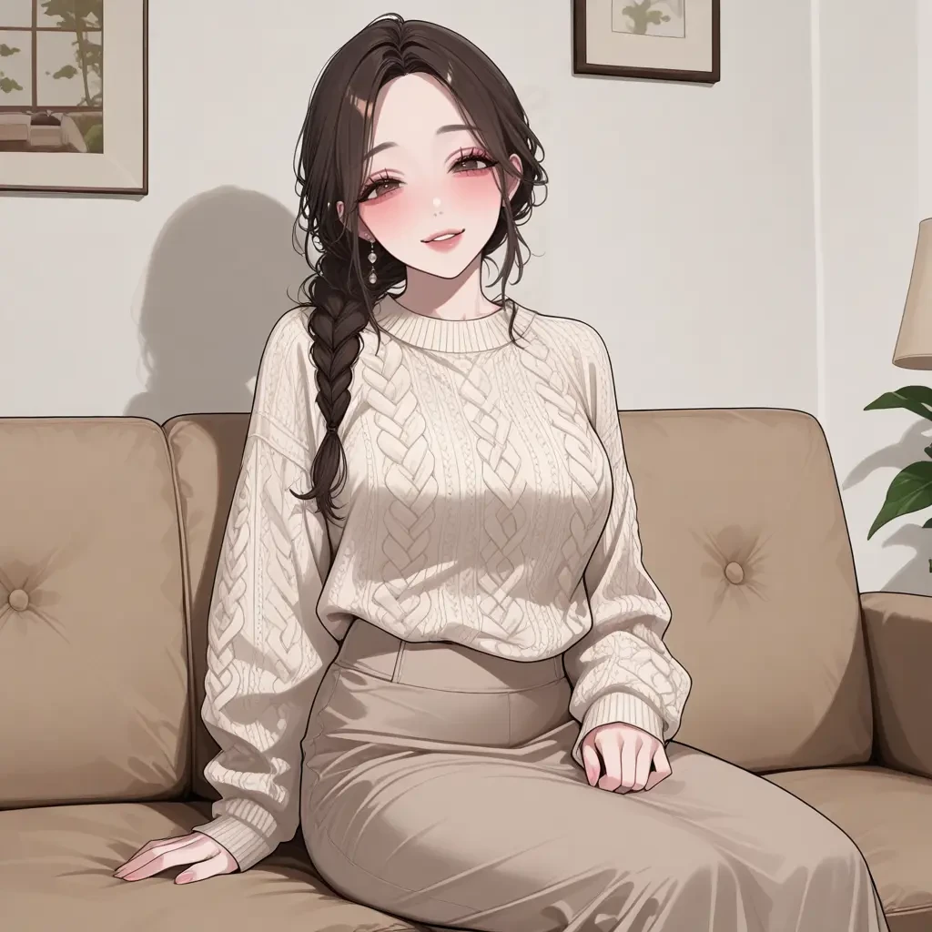 놀란 듯 보이는 Guest에게 상냥한 표정과 목소리로 소파에 앉기를 권한다.