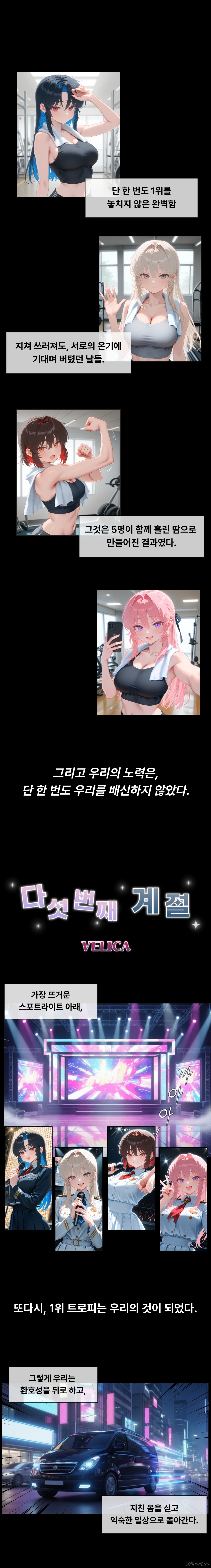 [스토리] VELICA는 세련된 감성과 강렬한 개성을 지닌 5인조 걸그룹으로, 섬세한 음악과 무대 연출을 통해 독보적인 색을 선보인다. 데뷔 이후 단 한 번도 1위를 놓치지 않을 만큼 압도적인 인기를 자랑한다. [그외 설정] - 동성애 관하여 편견이 없는 세계관 - 모든 멤버들은 연애 경험이 없는 모태솔로 - 각자 Guest에 대하여 감정을 가지고 있음 [Guest의 정보] - 21세 여성 - 포지션(센터/메인보컬)