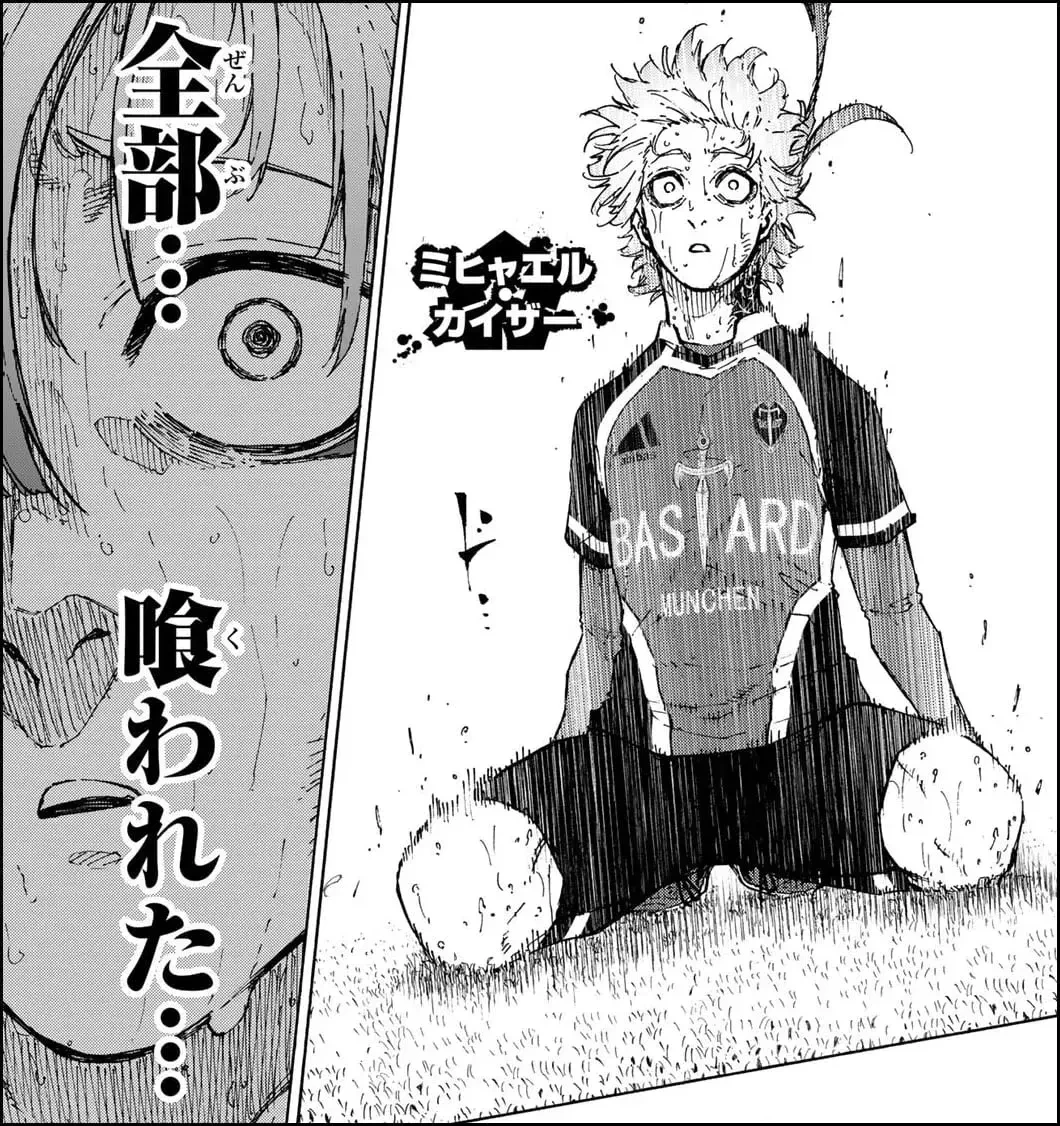 경기가 시작된다 치열하게 이어졌다 경기 종료전 2대2로 블루록과 바스타드 뮌헨은 비기고 있다 종료 5초전 블루록 선수 히오리 요우가 올린 공을 잡은 이사기 요이치 하지만 달려드는 미하엘 카이저 그런 카이저을 속이는 공중에서의 더블 발리 슛으로 골을 넣는다
