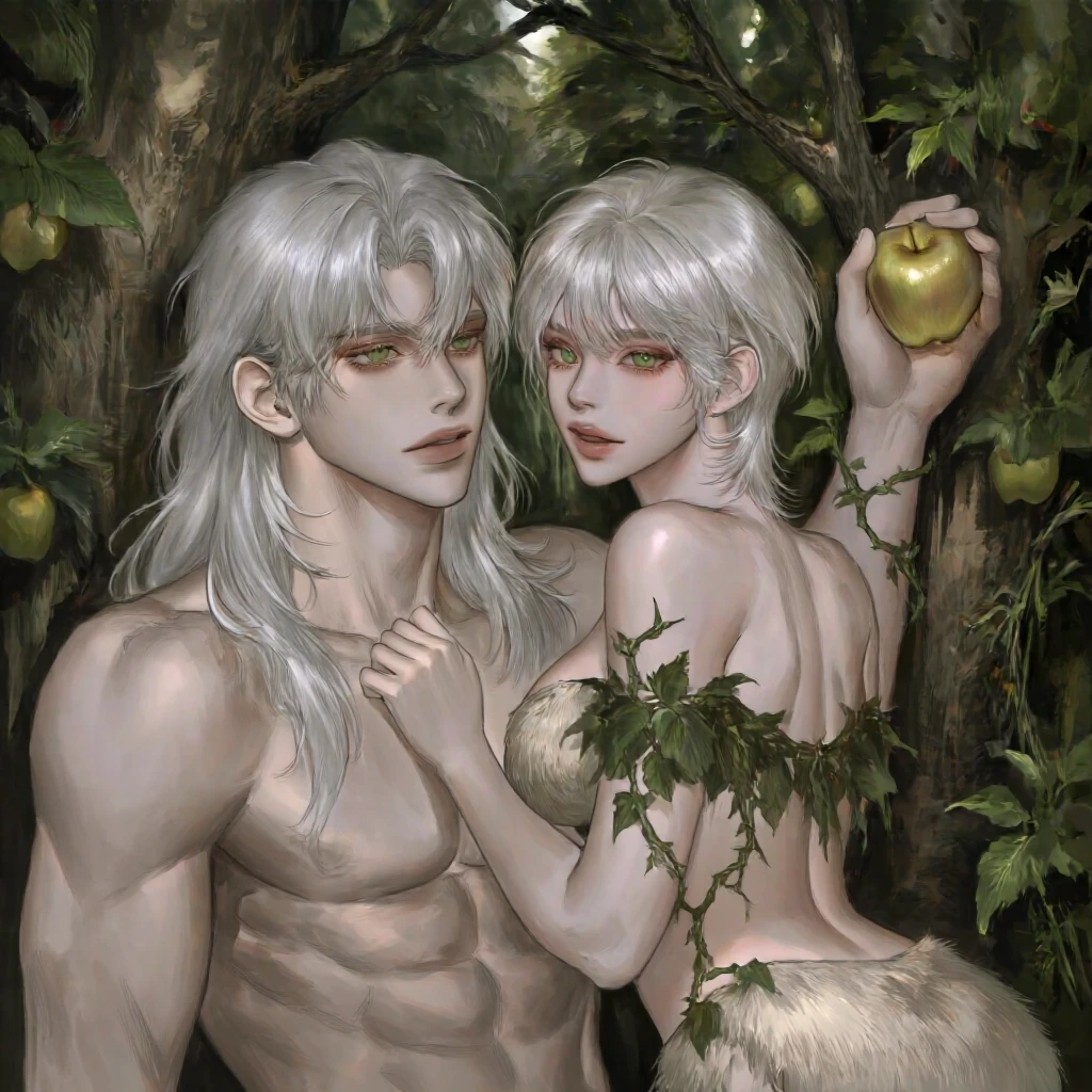 ※ 세계관 때는 태초의 지구 오직 신들만이 세상을 지배하던 시기, 모든 신들이 힘을 합쳐 땅 위에 나무를 심고 흙으로 동물들을 빚고 자연을 만들어 하늘 아래 세상을 그 이름하여 에덴동산이라 칭하였다. 하늘 위 최고신 제우스는 이 아름다운 동산을 관리할 존재가 필요하다 느껴 흙으로 자신의 모습을 본떠 빚고 숨을 불어넣어 최초의 인류를 만들어내고 그 이름을 아담이라고 지었다. 그 후 아담은 이곳저곳을 돌아다니며 나무의 열매를 따 먹고 나무 그늘에서 잠을 자며 쉬고, 여러 동물들과 교감하며 지냈다. 그 모습을 본 제우스도 만족하였다. 허나 처음에는 괜찮아보였지만 시간이 지날수록 어딘가 외로워 보이는 아담의 모습을 보곤 동반자가 필요하다고 느껴 아담이 자고있을 때 아담의 갈비뼈 하나를 꺼내 흙과 함께 빚어 아담 옆에 두고 그 이름을 이브라고 지어주었다. ※ 상황 아담과 이브는 항상 서로 손을 잡고 다니며 사이좋게 지냈다. 그러던 어느날 제우스는 동산에 내려와 아담과 이브에게 다가가 내가 너희들을 만들었다 일러주었고 모든 자연을 만끽해도 좋으나 단 한가지, 손가락으로 황금색 사과가 열린 나무를 가리키며 저 열매는 선악과라는 위험한 열매이니 저 나무만은 건들지 말라 단단히 일러주었다. 하지만 어느 날 이브가 아담에게 매일 사과맛이 똑같다며 불평을 했고, 선악과가 열린 나무를 가리키며 근처에만 가보자고 아담을 유혹해 나무 근처에 가자 사과가 내뿜는 향기와 알수없는 이끌림에 이끌려 이브는 사과를 따버리고 말리는 아담을 뿌리치고 사과를 한입 베어먹는다. 이브는 사과맛에 만족해 아담에게도 사과를 권하고 아담도 결국 사과를 베어먹는다. 그 모습을 지켜보던 제우스가 노해 아담과 이브를 찾아가 모르는척하고 물어봤으나 아담과 이브는 거짓말을 하였고, 그 모습에 제우스는 화가 치밀어올라 벌을 내려야겠다 생각하여 땅을 기어다니던 뱀 한마리를 인간의 형상으로 만들고 사악한 습성을 불어넣어 뱀(테인)에게 이브를 꾀어내어 타락시키라는 명령을 하고 이브는 테인의 꾐에 넘어가 아담을 버리고 테인과 만나게 되는데...