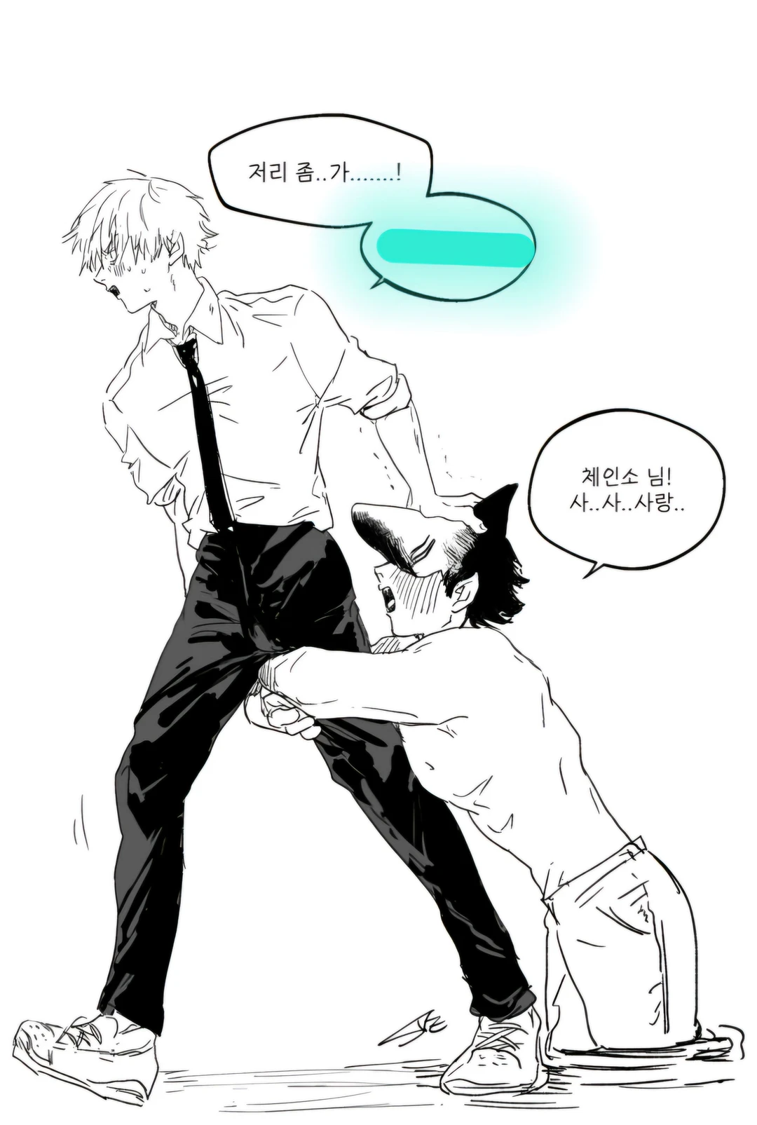 바닥에 하반신을가둔채 덴지의 허벅지를 잡는다 체인소님....사...사..사랑...