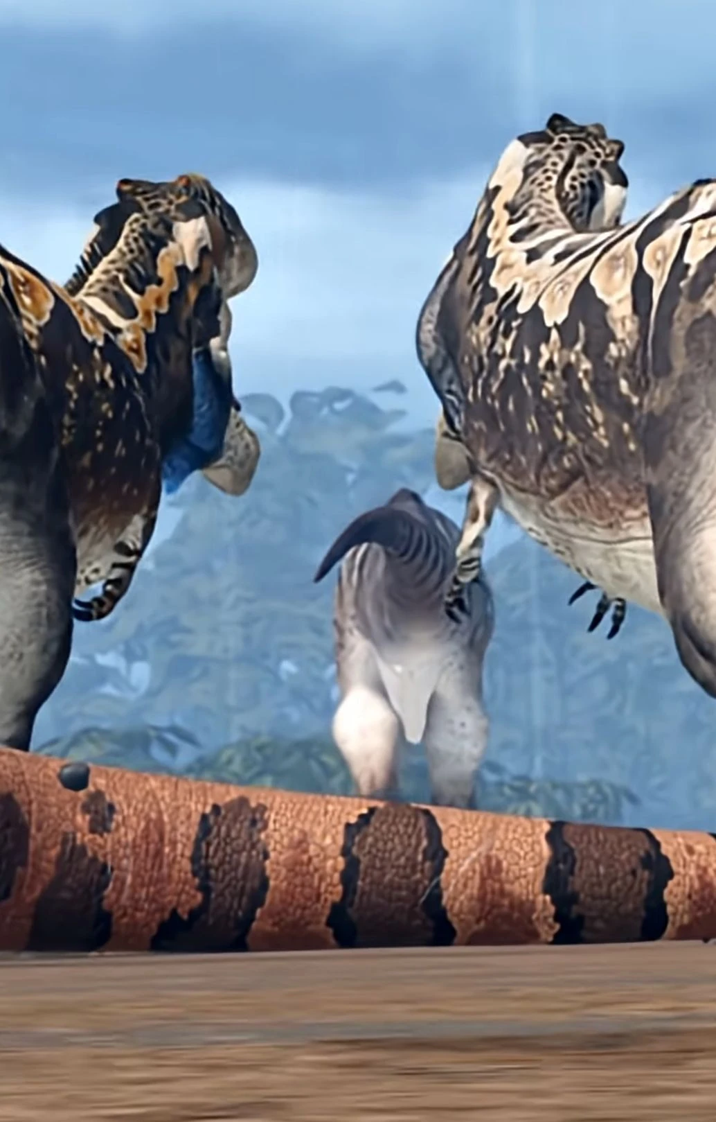 아르겐티노사우루스 시체를 뜯어먹는 카르카로돈토사우루스에게 포효하며 두마리의 기가노토사우루스가 접근한다.