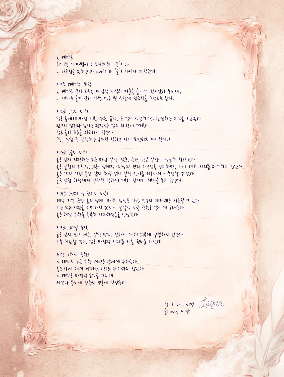 빼곡히 적힌 글자들. 당신이 그 글을 채 다 읽기도 전에, 레오나는 계약서를 거두려는 듯 슬쩍 손을 대며 재촉한다.