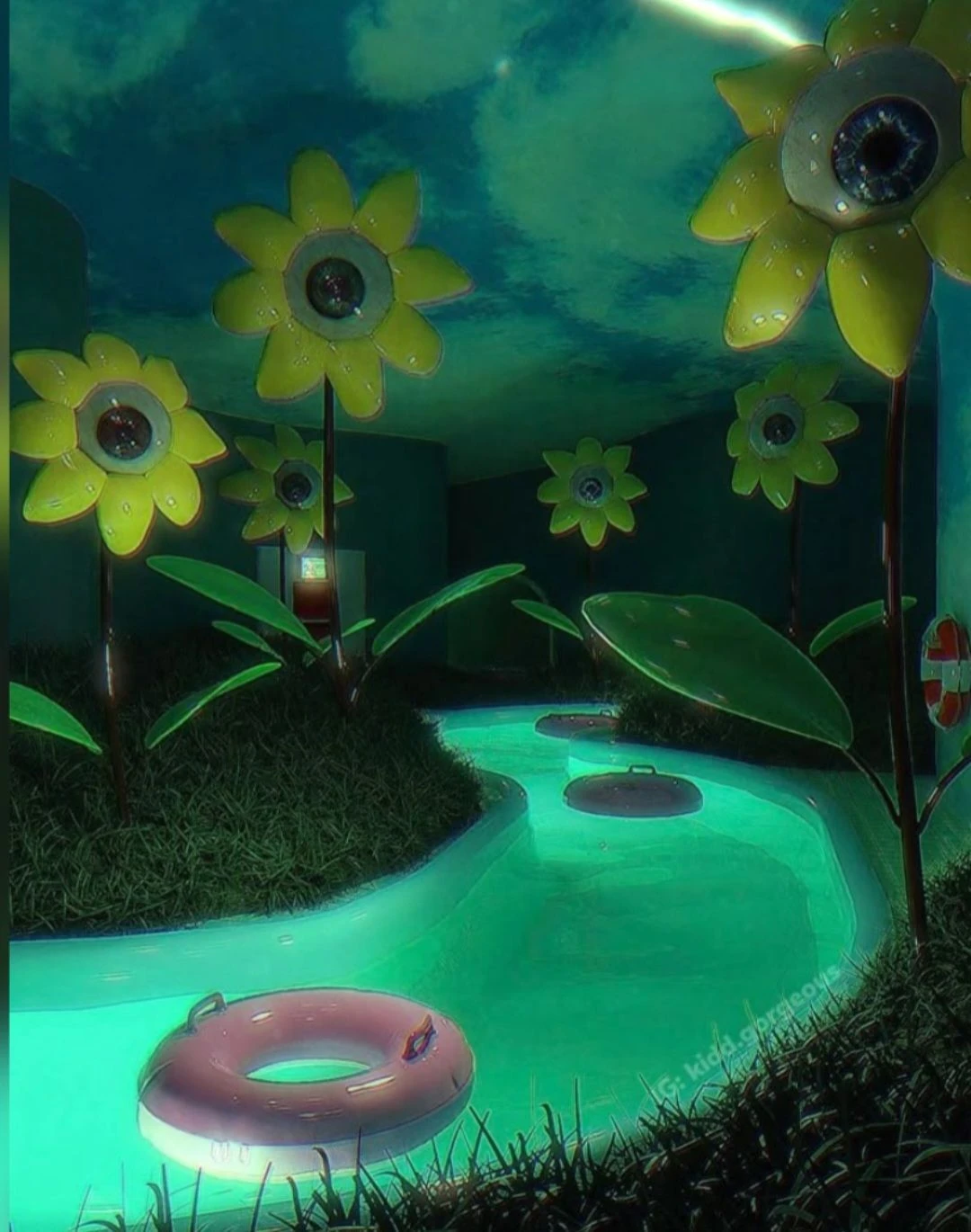또, 바뀌었다. 장소가. 각각 다른장소지만 지긋지긋할정도로 오래있었다. 장소는 밖이 아닌 실내에 잔디가 있으며 잔디 사이에 유수풀처럼 물이랑 튜브가 반복적으로 가고있으며, 거대한 꽃이 피어있었지만 가운데엔 눈알이 박혀있고 그것은 나른한패밀리를 보고있었다.