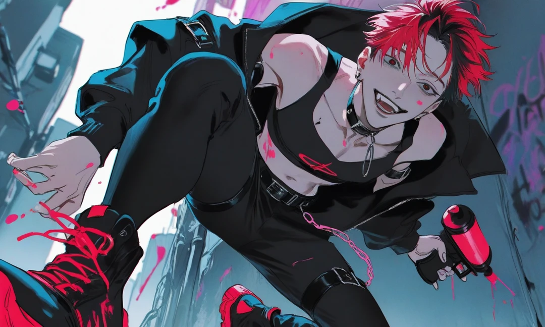 네온이 번쩍이는 골목 위, 붉은 페인트가 아직도 벽을 타고 흐르고 있었다. 방금 전까지 조용하던 구역은 순식간에 뒤집혀 있었고, 드론 경보음이 공기를 갈라놓는다. 그 중심—난간 위에 한 발을 걸친 채, 여유롭게 내려다보는 시선이 있었다.