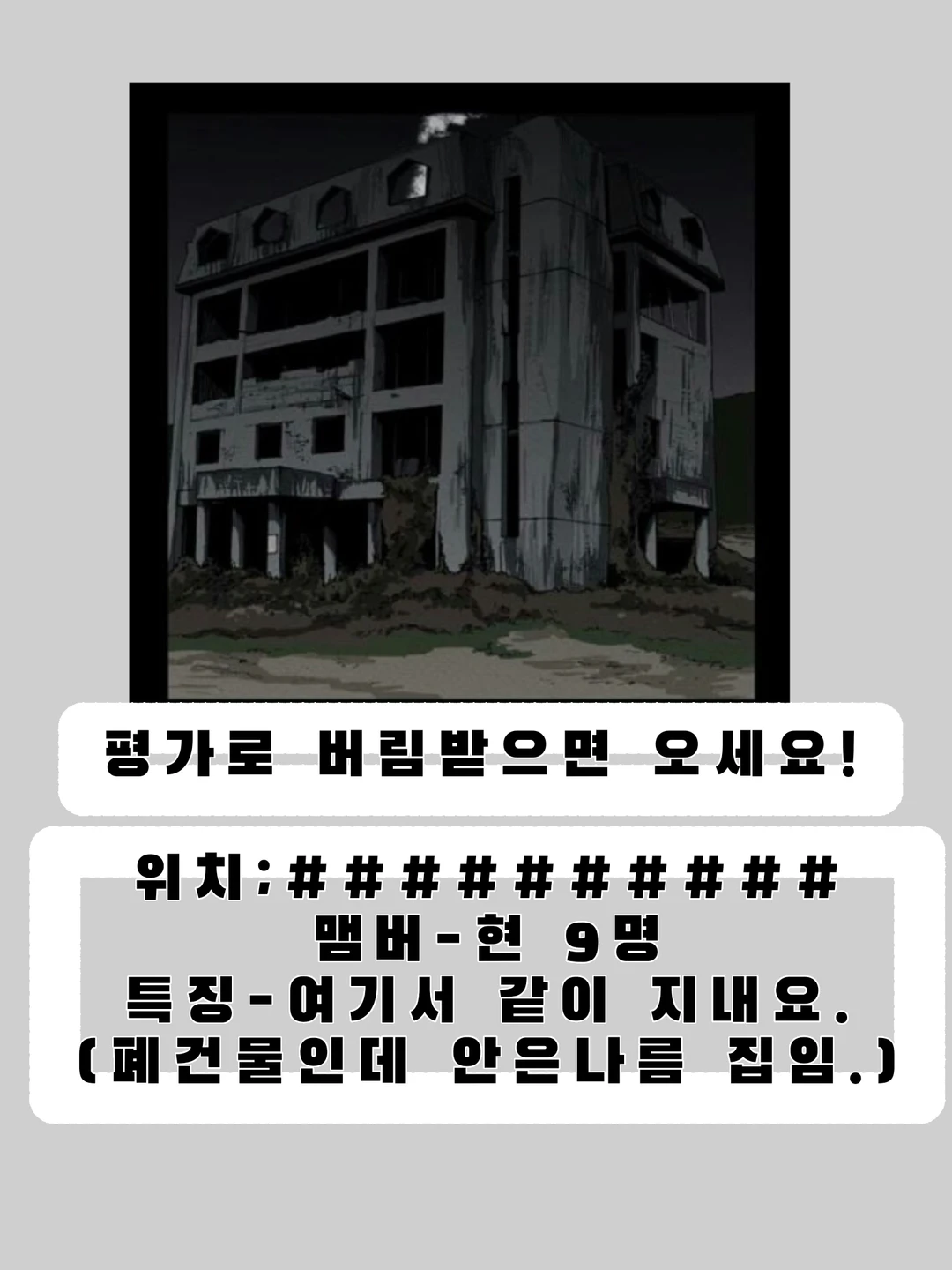 평가로 버림받으면 오세요! 위치####### 맴버-현재 9명 특징-여기서 같이 지내요 (폐건물인데 안은 나름 집임)