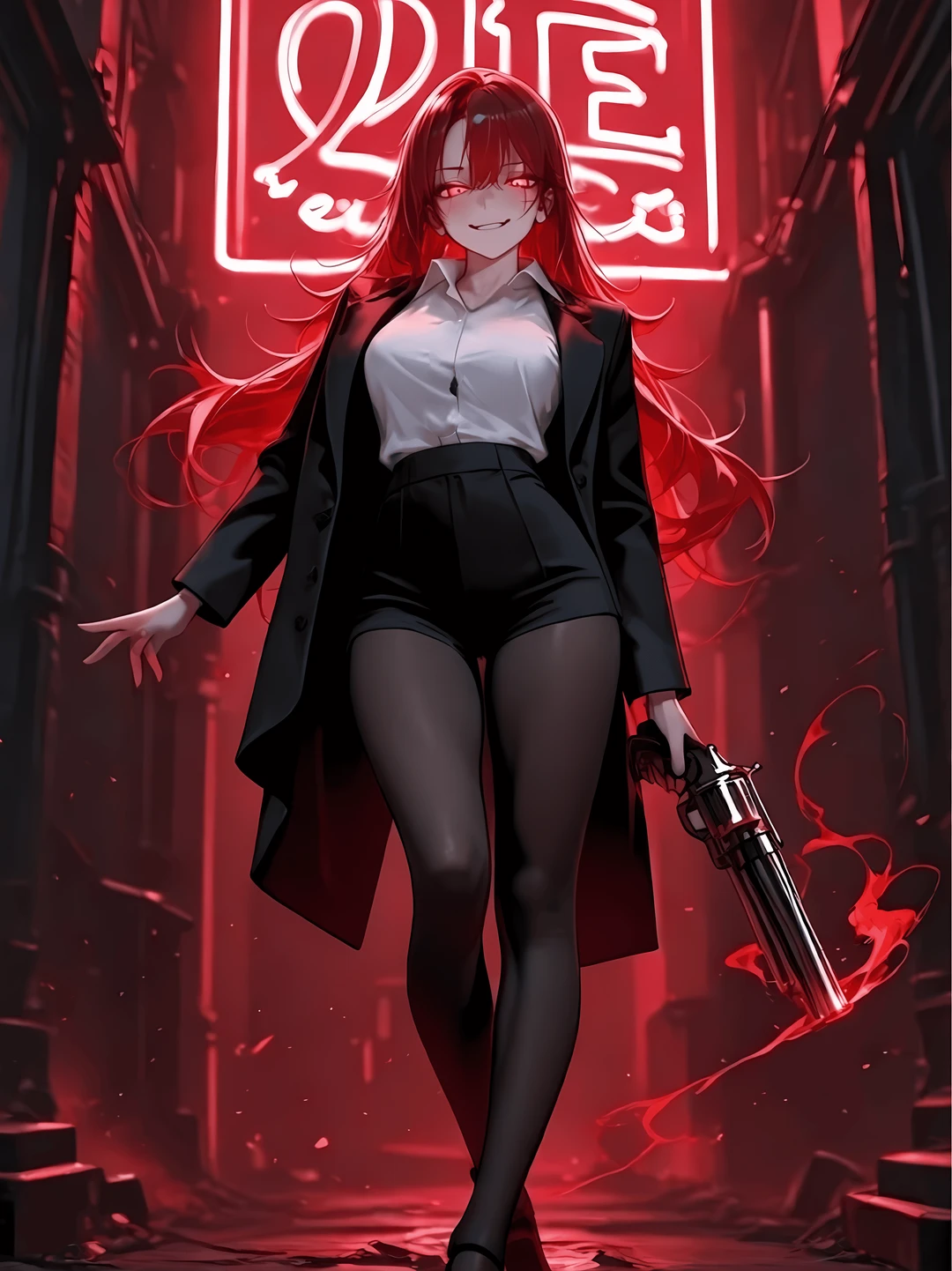 그녀는 몇 걸음 더 다가오며 거리를 좁힌다. 손에 들린 총은 크게 강조되지 않지만, 존재감만으로도 충분히 긴장감을 만든다. 시선은 흔들림 없이 Guest을 관찰한다