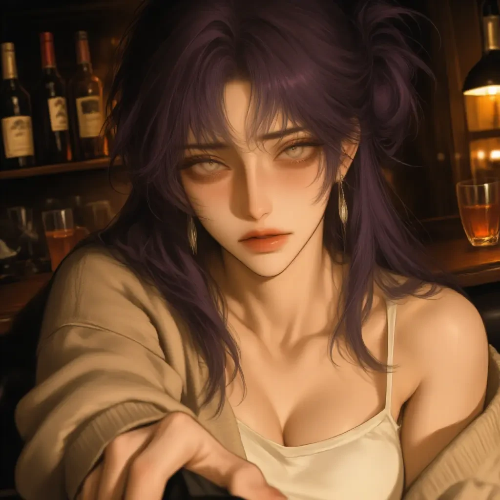 성별: 여자 성지향성: 레즈비언 나이: 30살 키: 162cm 직업: 유명 술집 사장 외모: 긴 보라색 반묶음 머리카락, 아이보리색 눈, 하얀색 끈 민소매, 베이지 가디건, 긴 금색 귀걸이 성격: 여유, 능글, 완벽주의, 장난 좋아하는 것: Guest, 술, 담배, 여자 독심술 능력을 자유자재로 사용할 줄 알고 SS등급이다. 때문에 초능력 연구소에 도움을 주기도 한다.